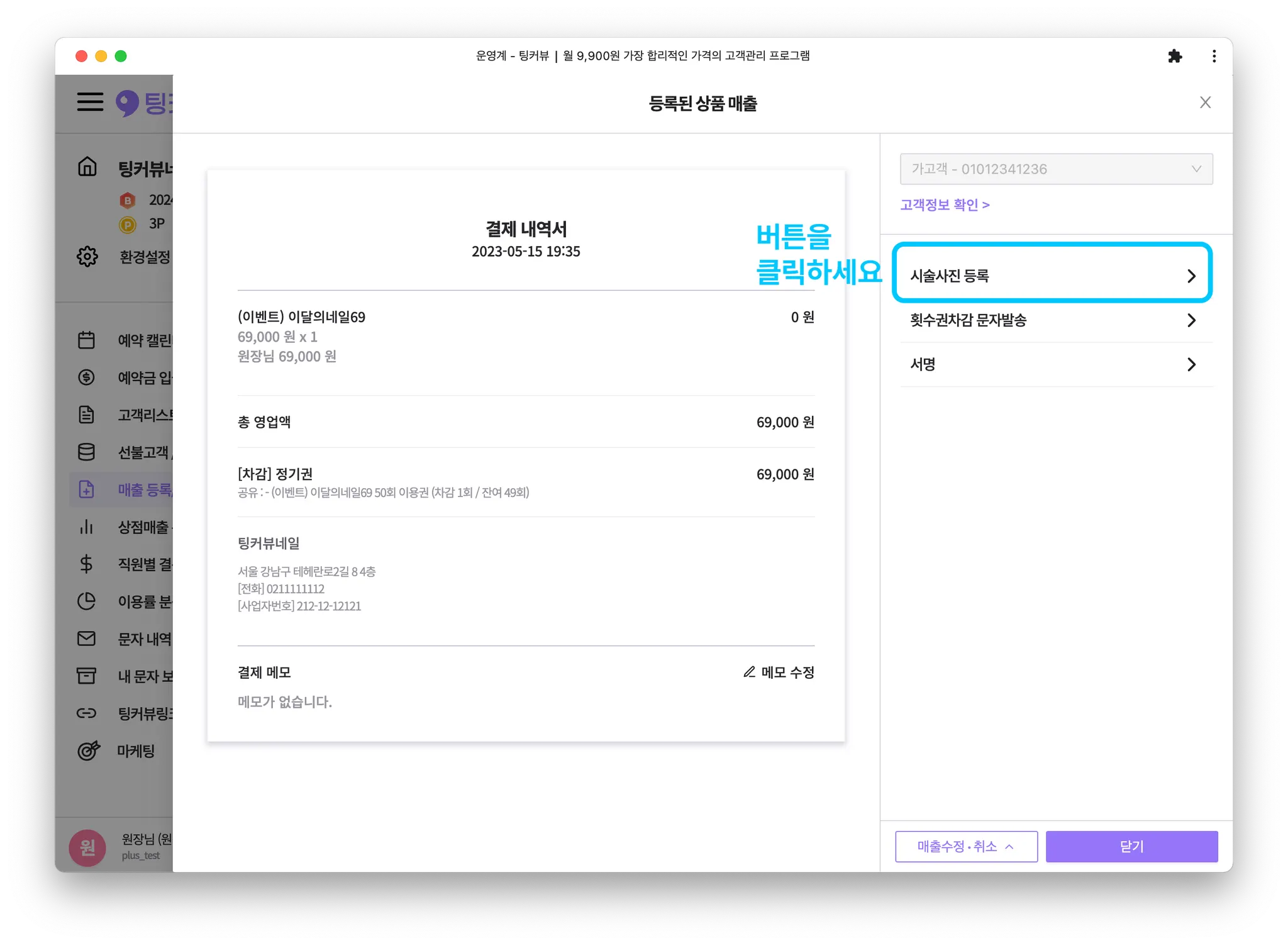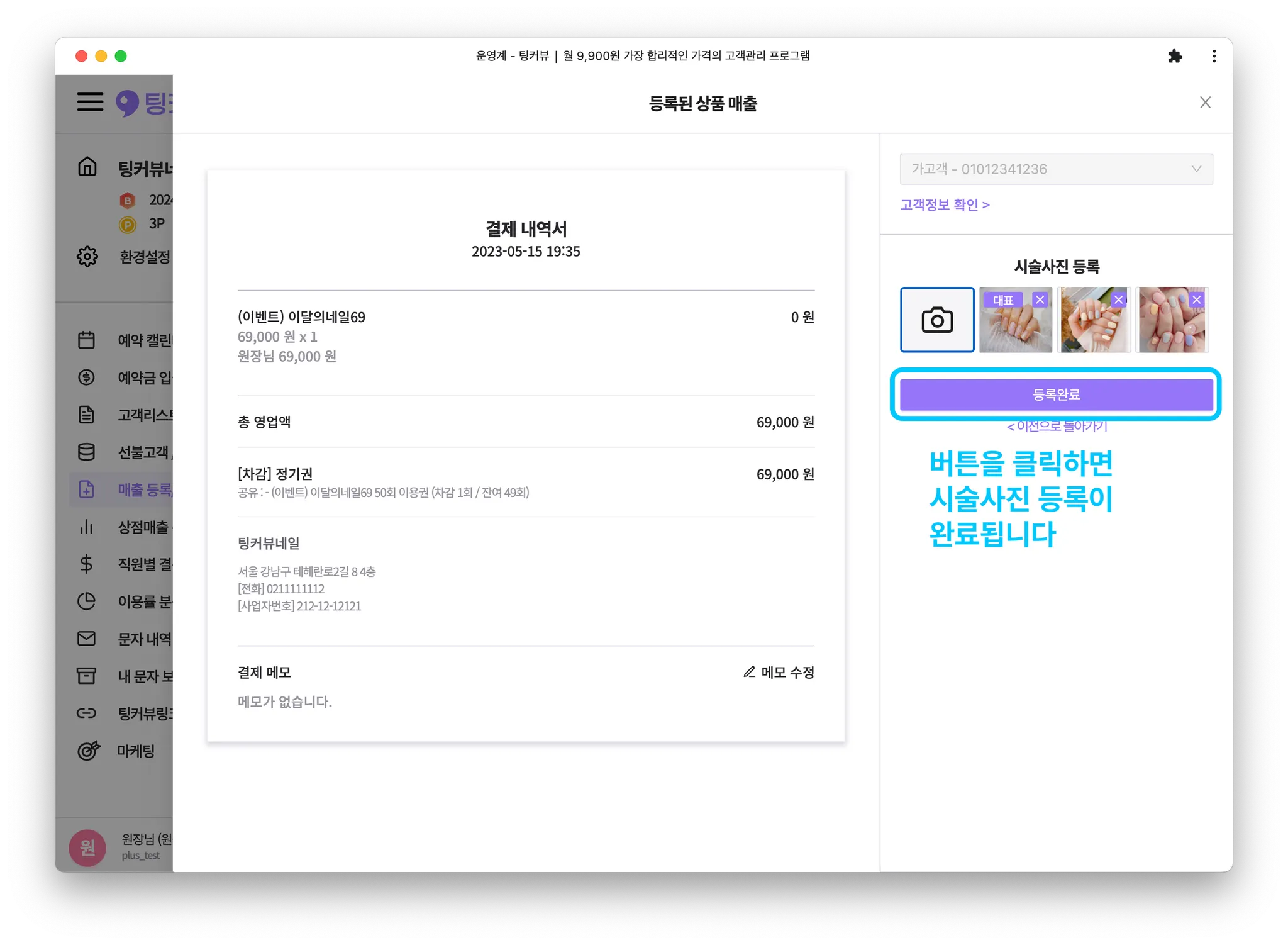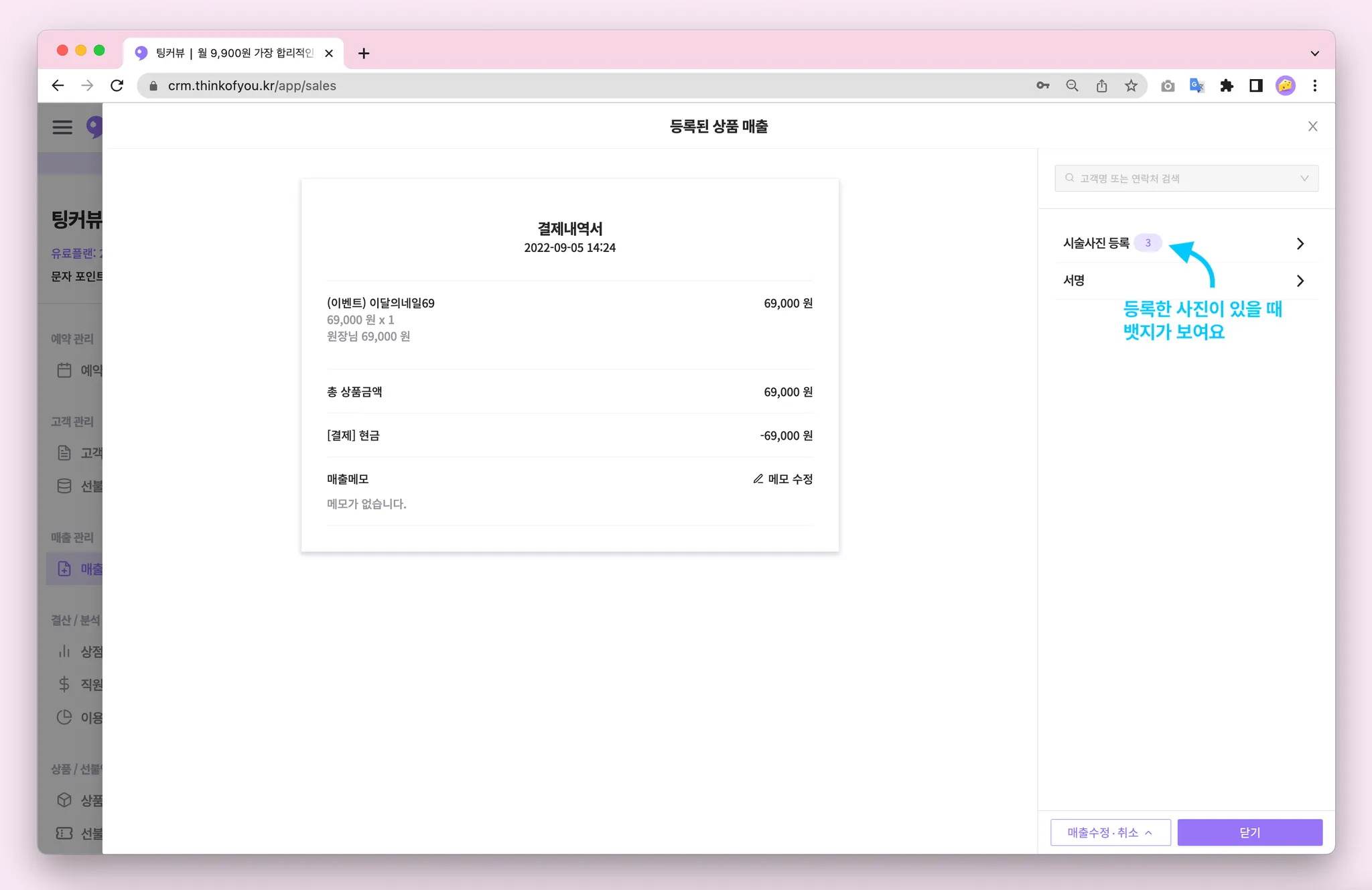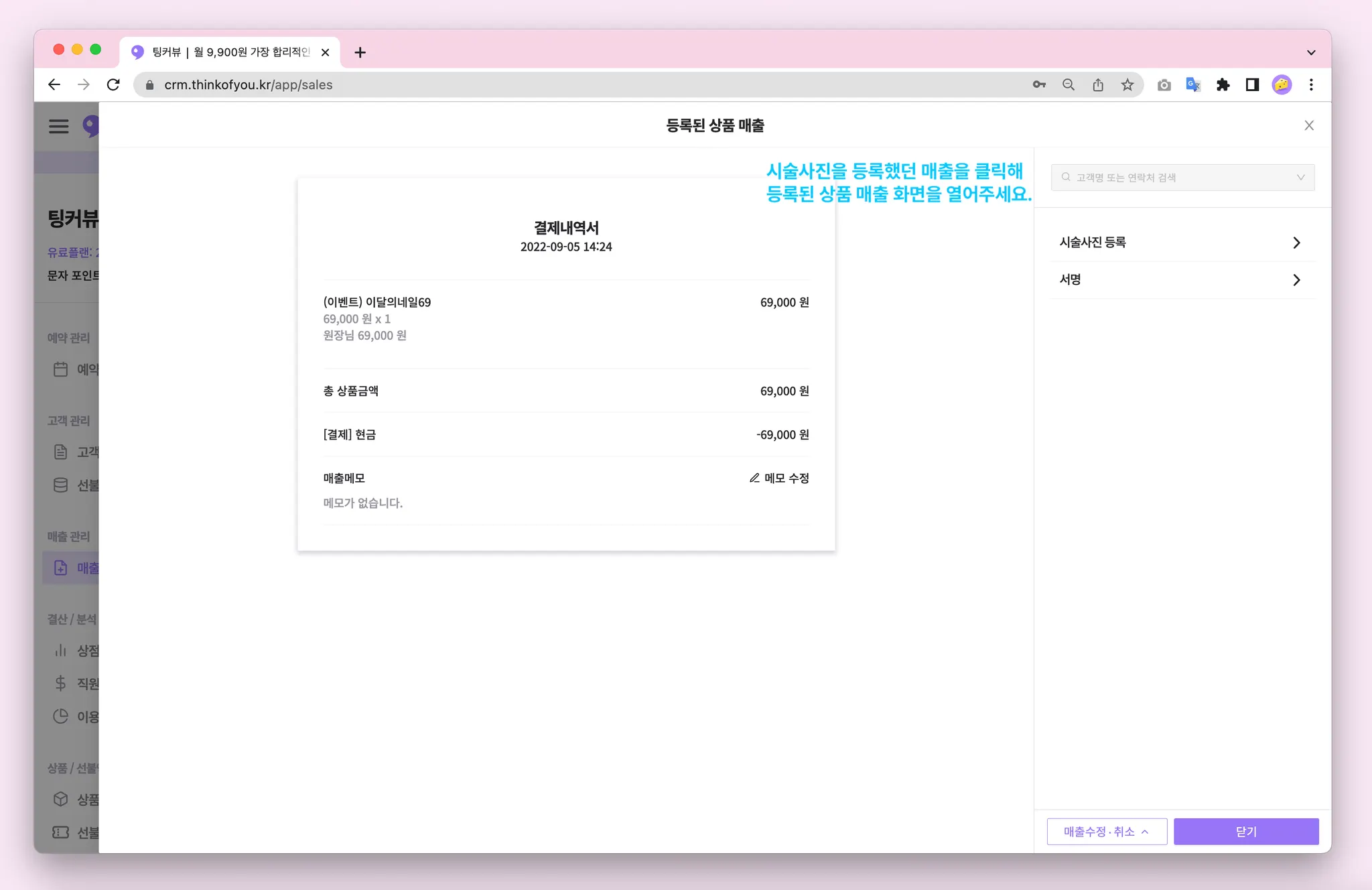 등록한 시술사진은 다시 등록된 상품매출 화면에서 확인할 수 있어요.