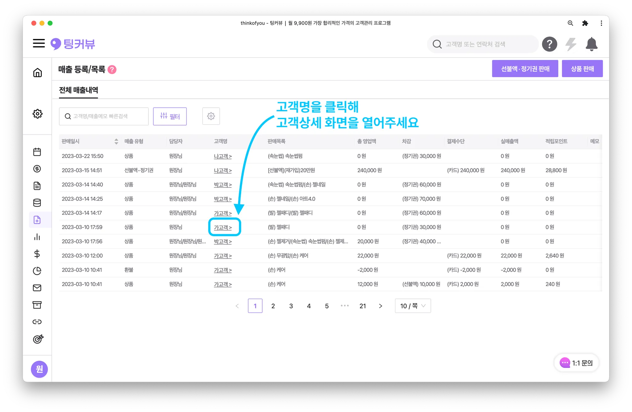 고객명을 클릭해 고객상세페이지를 열어주세요.