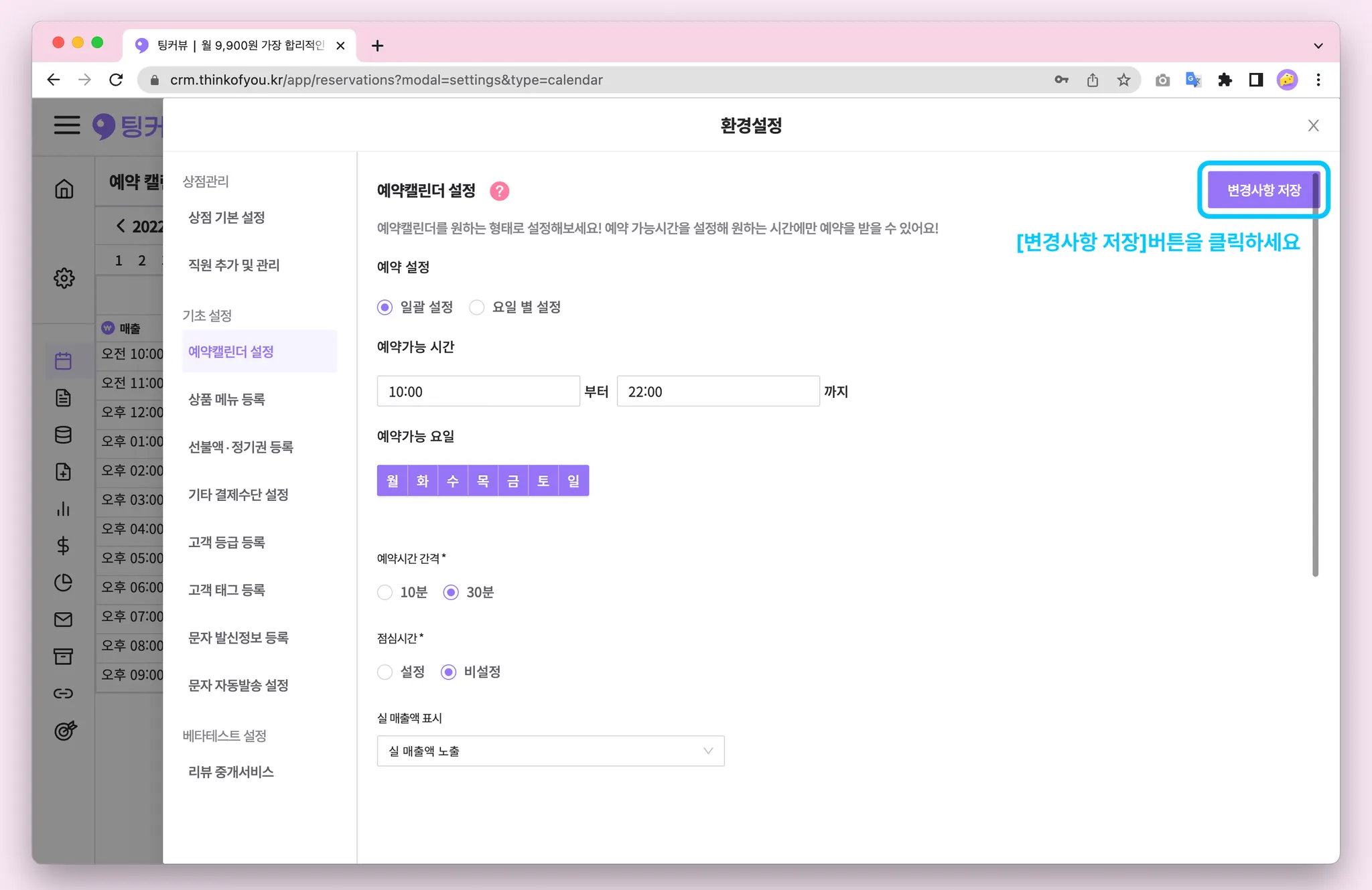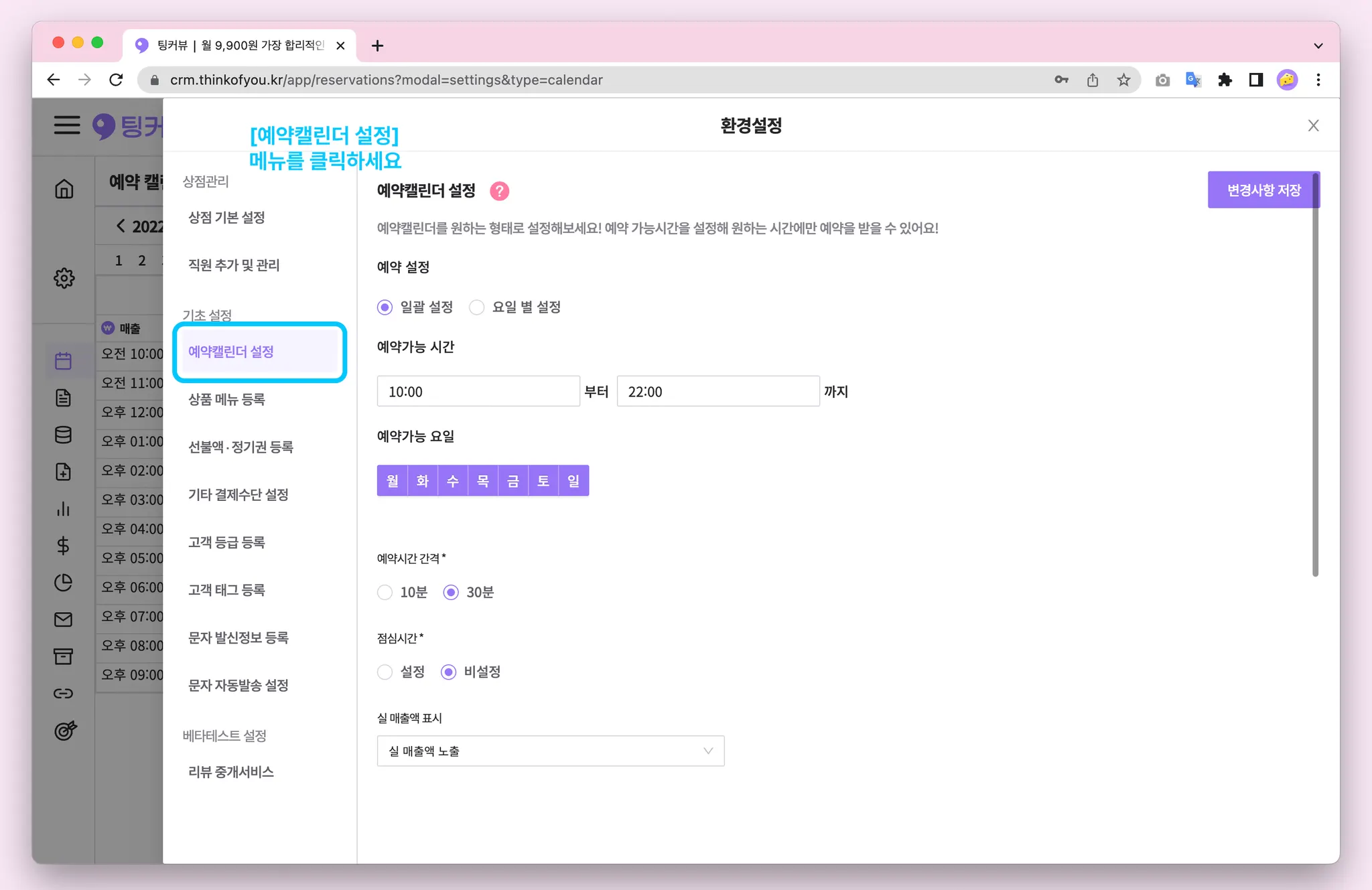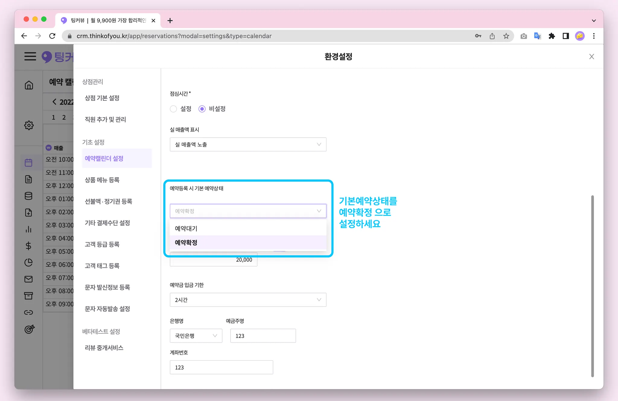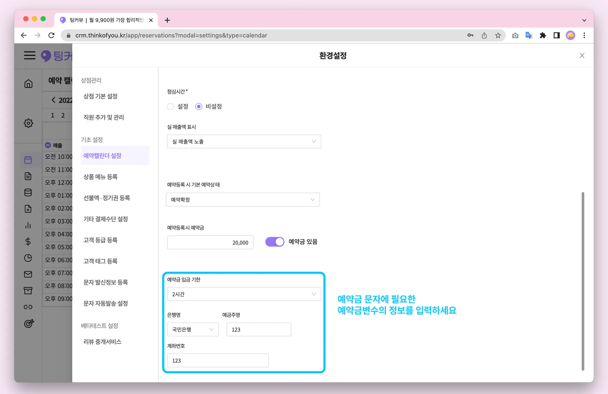 예약금을 관리하고 예약금문자를 발송하려면 예약금관련 설정을 미리해야겠죠?