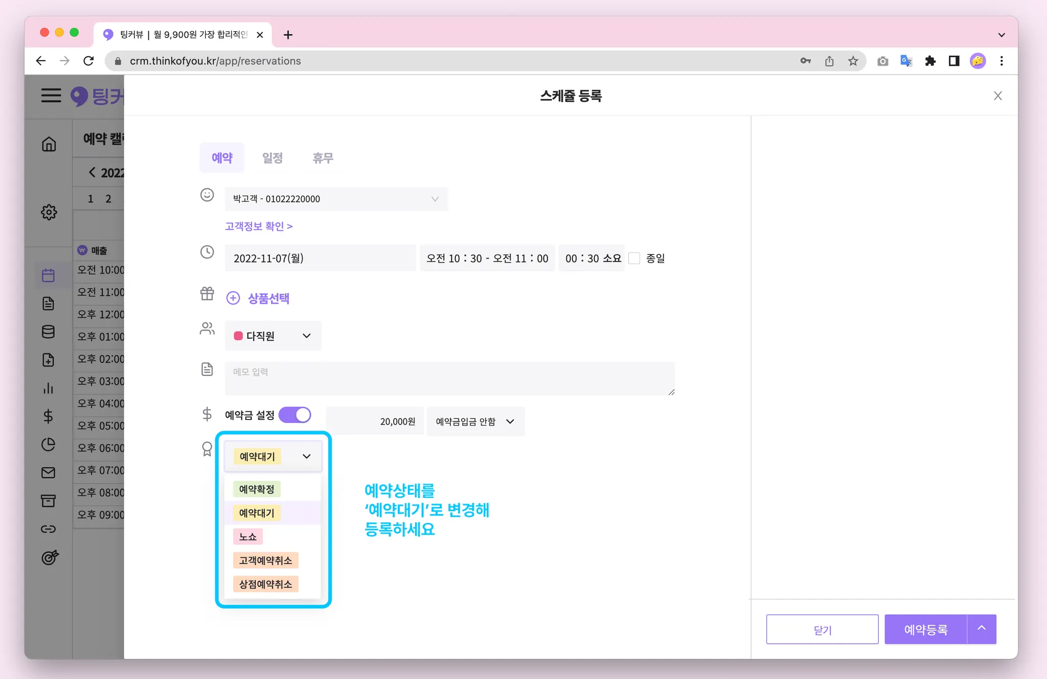 예약을 받을 때 선불액이 없는 고객이라면? 예약상태를 ‘예약대기’로 변경해 등록해주세요! 예약대기 상태의 고객에게만 예약금문자가 자동으로 발송됩니다!