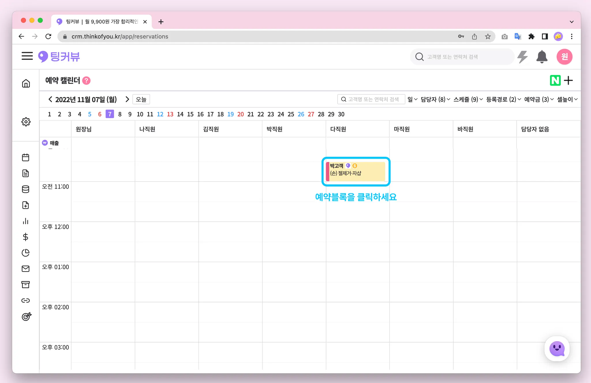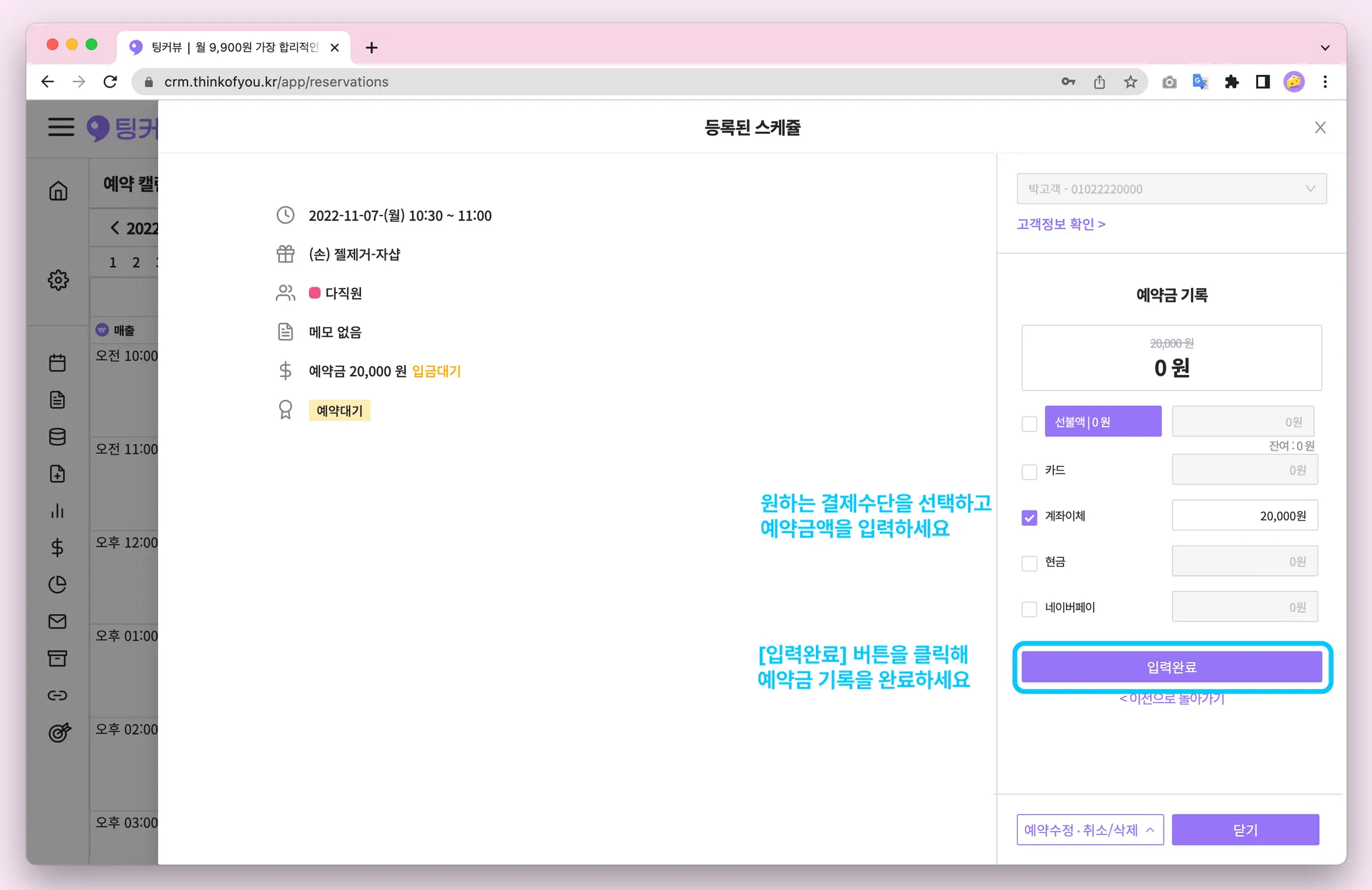 예약블록을 클릭 > 우측의 [예약금기록] > 결제금액입력 후 [입력완료]