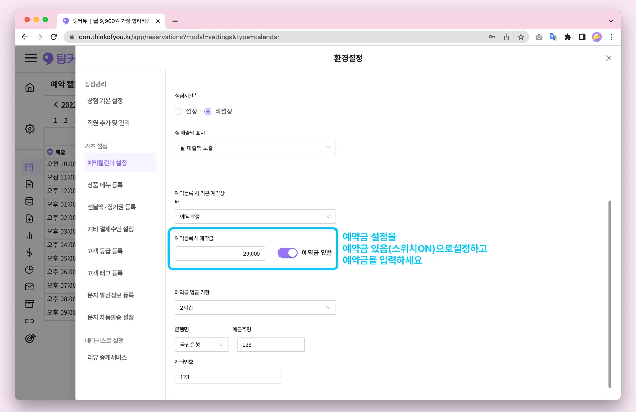 [환경설정] > [예약캘린더설정] > ‘예약등록 시 예약금’ 설정을 활성(스위치on) 시켜주세요!