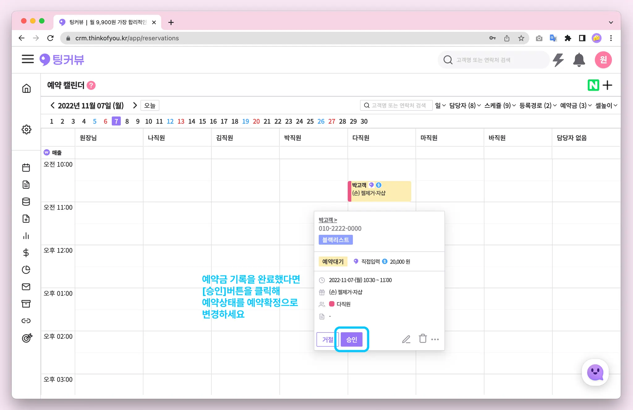 예약금 입금확인 및 기록을 완료한 예약은 예약확정으로 변경해주세요!