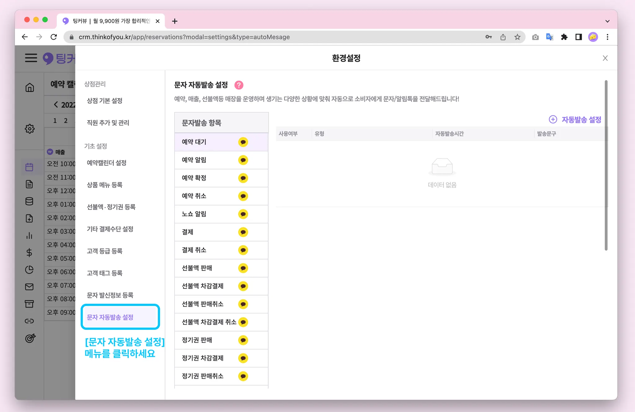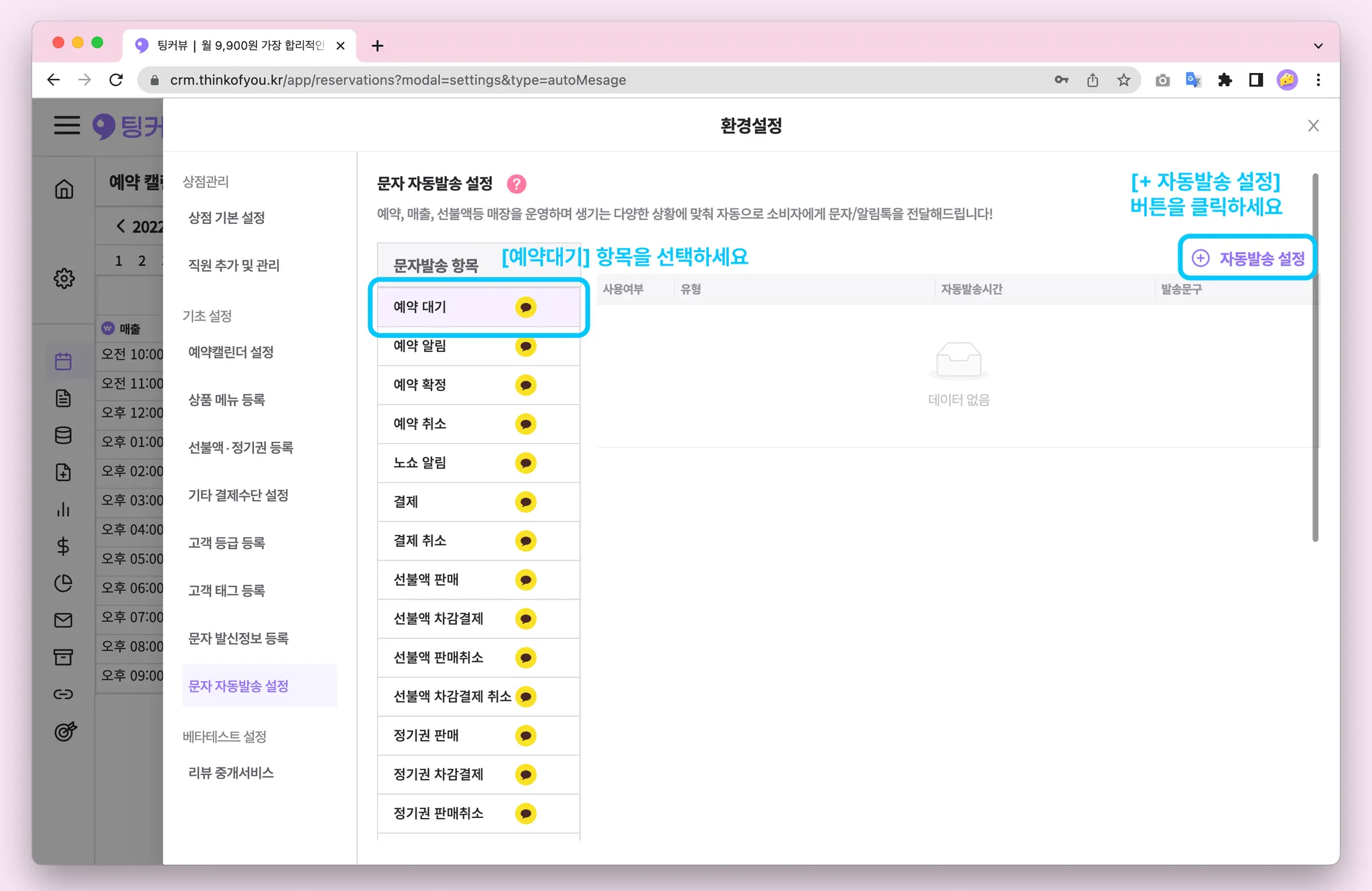 [환경설정] > [문자자동발송 설정] > [예약대기] > [+ 자동발송설정] 버튼을 클릭해주세요.
