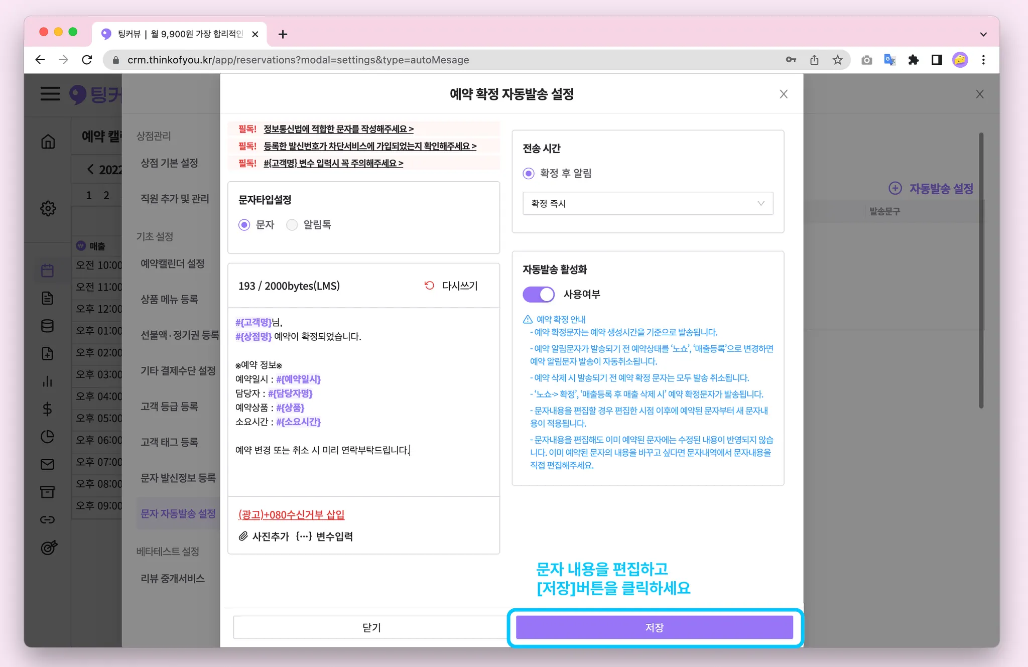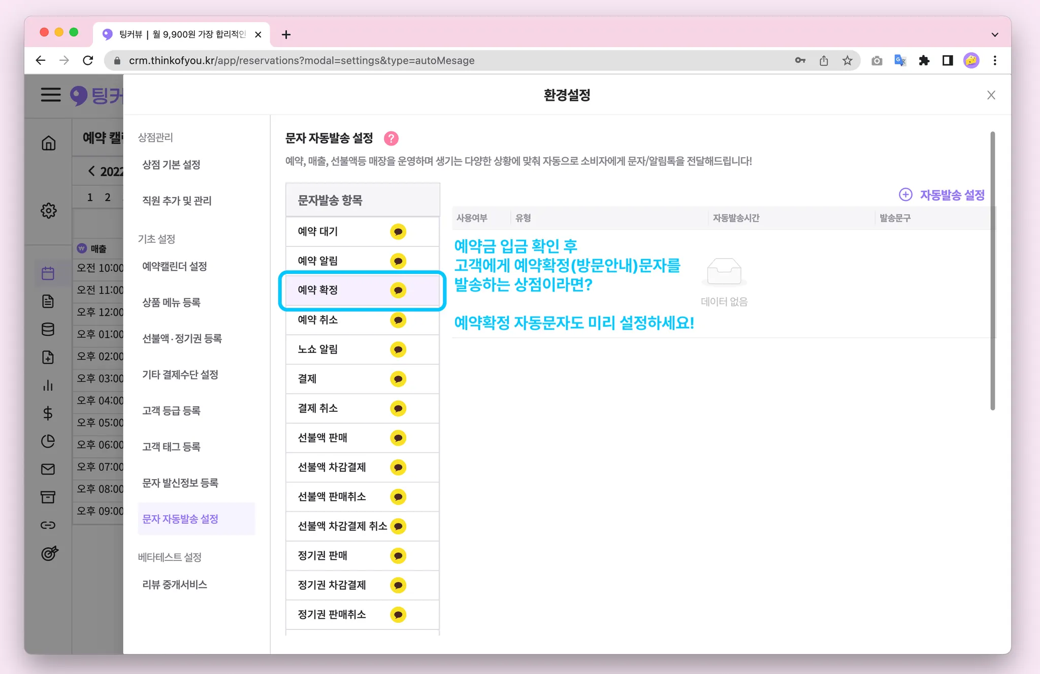 예약금 입금확인 후 고객에게 예약확정(방문안내)문자를 발송하는 상점이라면? 예약확정 자동문자도 미리 설정하세요!