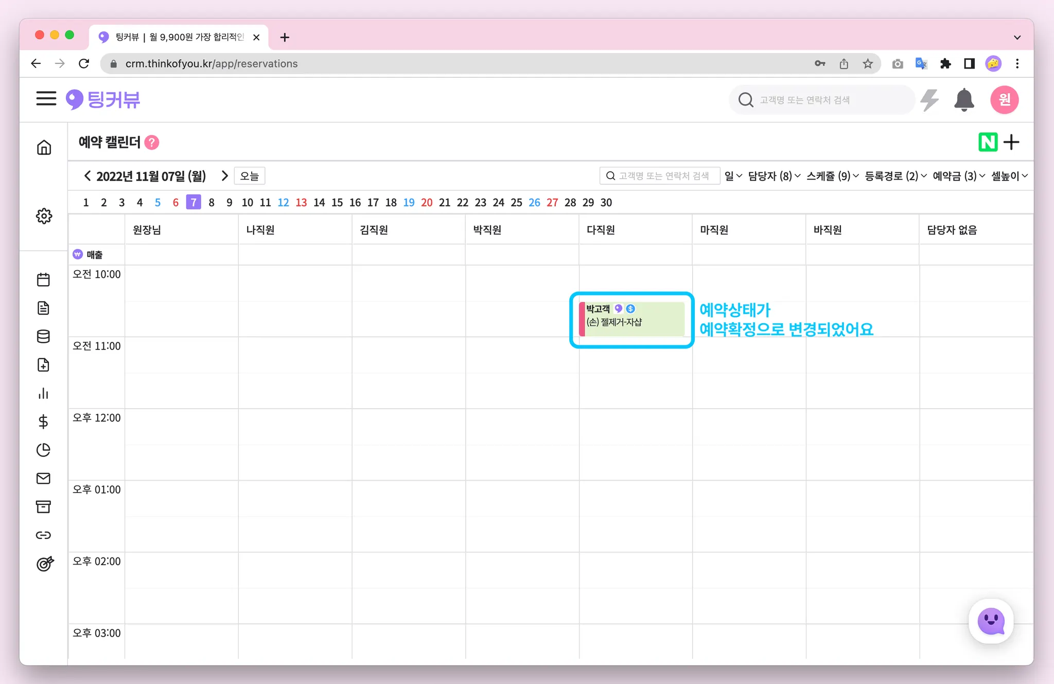 이제 예약금을 입금한 고객의 예약상태를 ‘예약대기’에서 ‘예약확정’으로 변경하면 예약확정 문자가 자동으로 발송됩니다