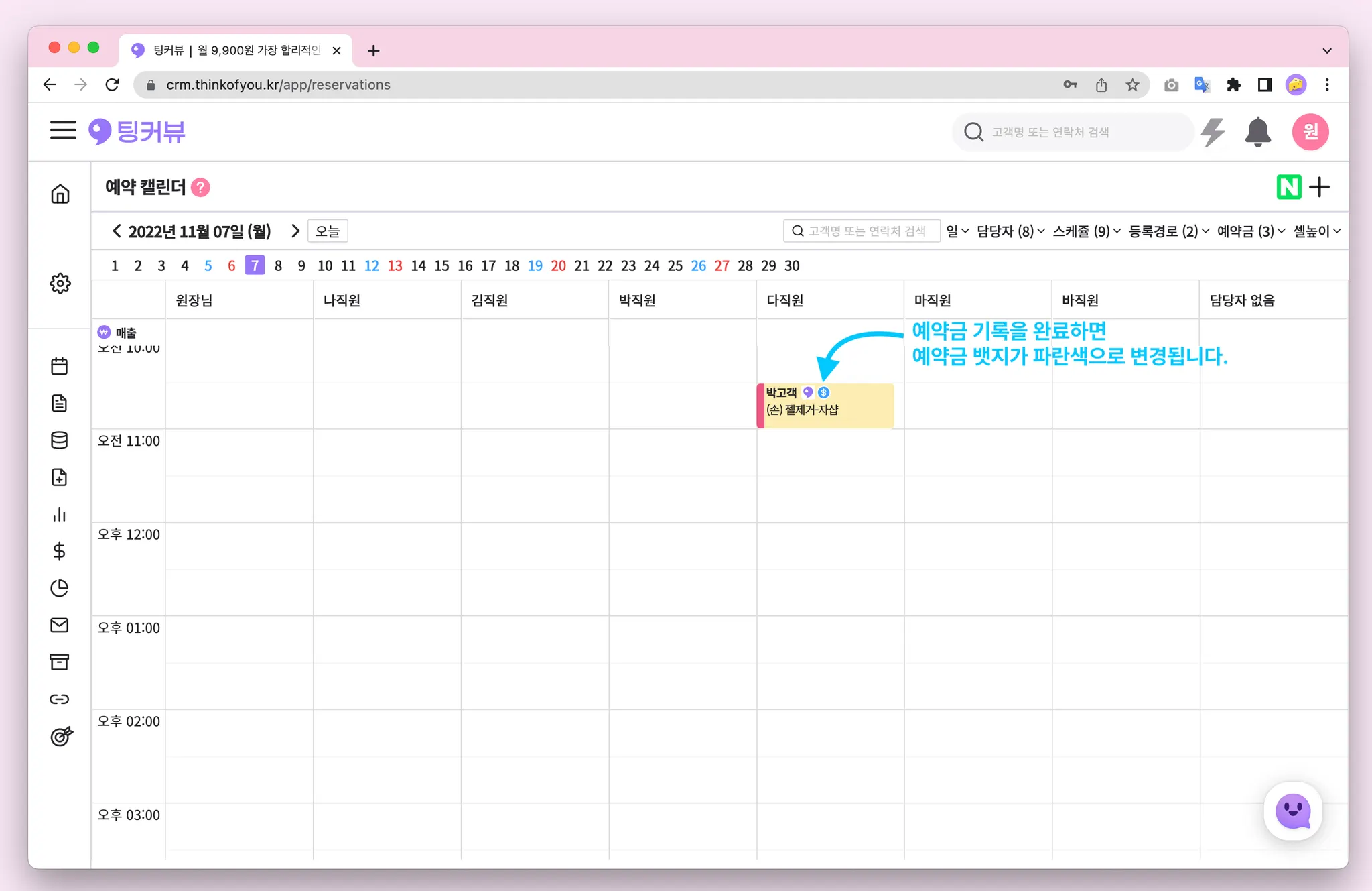 예약금입금이 확인되면 예약금아이콘이 파란색(입금완료)으로 변경됩니다!