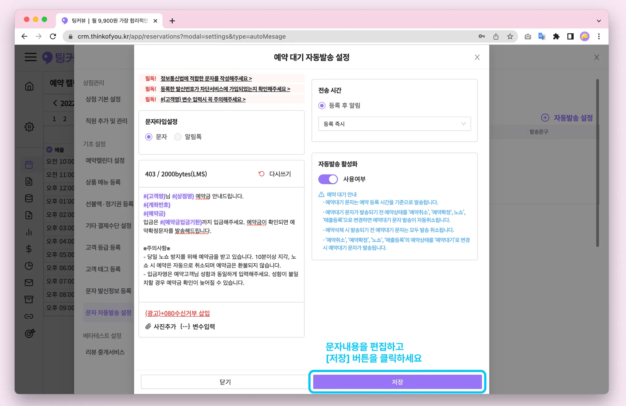 예약등록시 기본예약상태를 ‘예약확정’으로 설정했다면, 이제 ‘예약대기’상태의 예약에 문자가 자동으로 발송되도록 설정해볼까요?