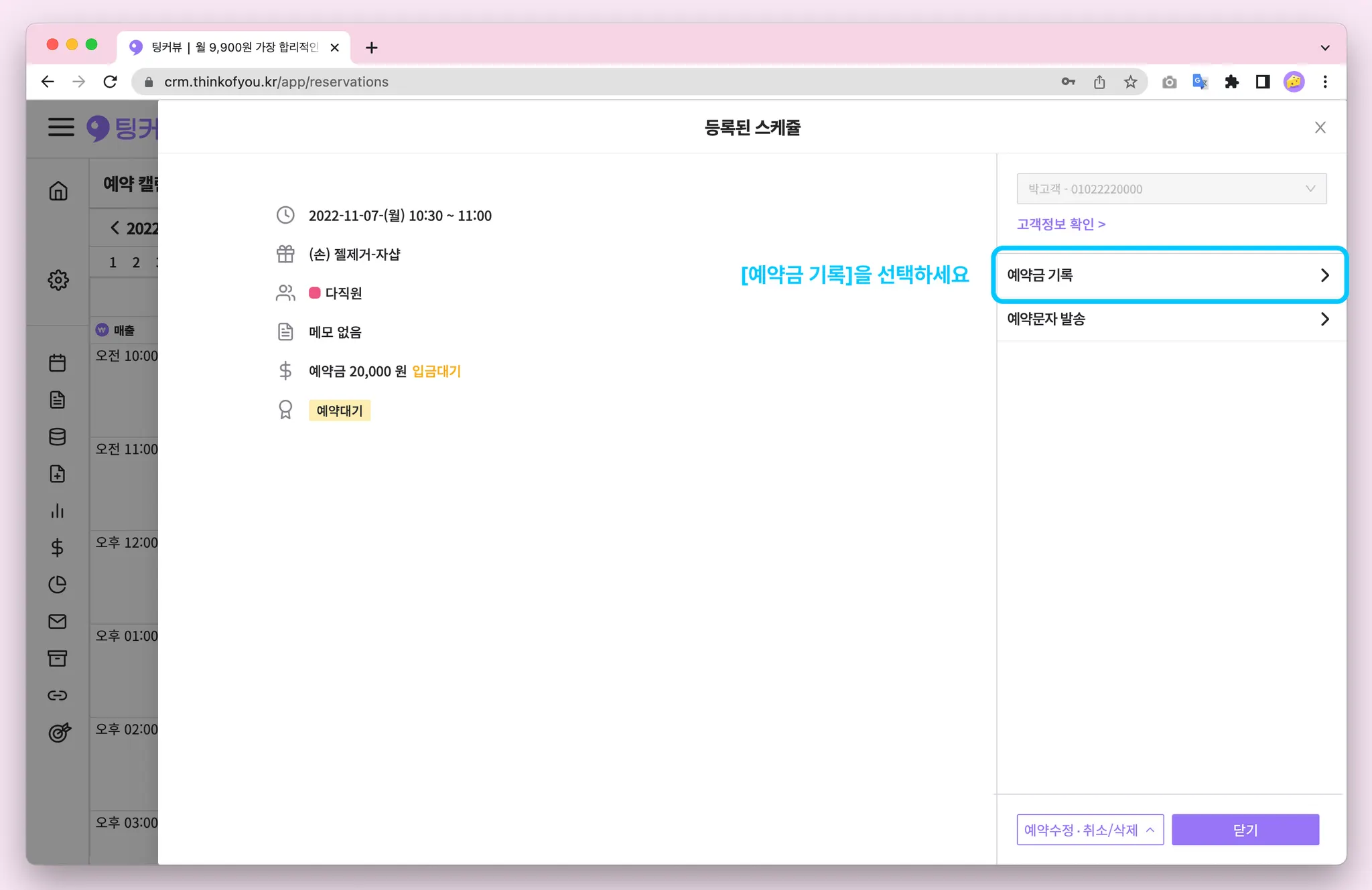 예약금문자를 받은 고객이 예약금을 입금했다면? 예약금을 기록하고 예약상태를 ‘예약확정’으로 변경해주세요!