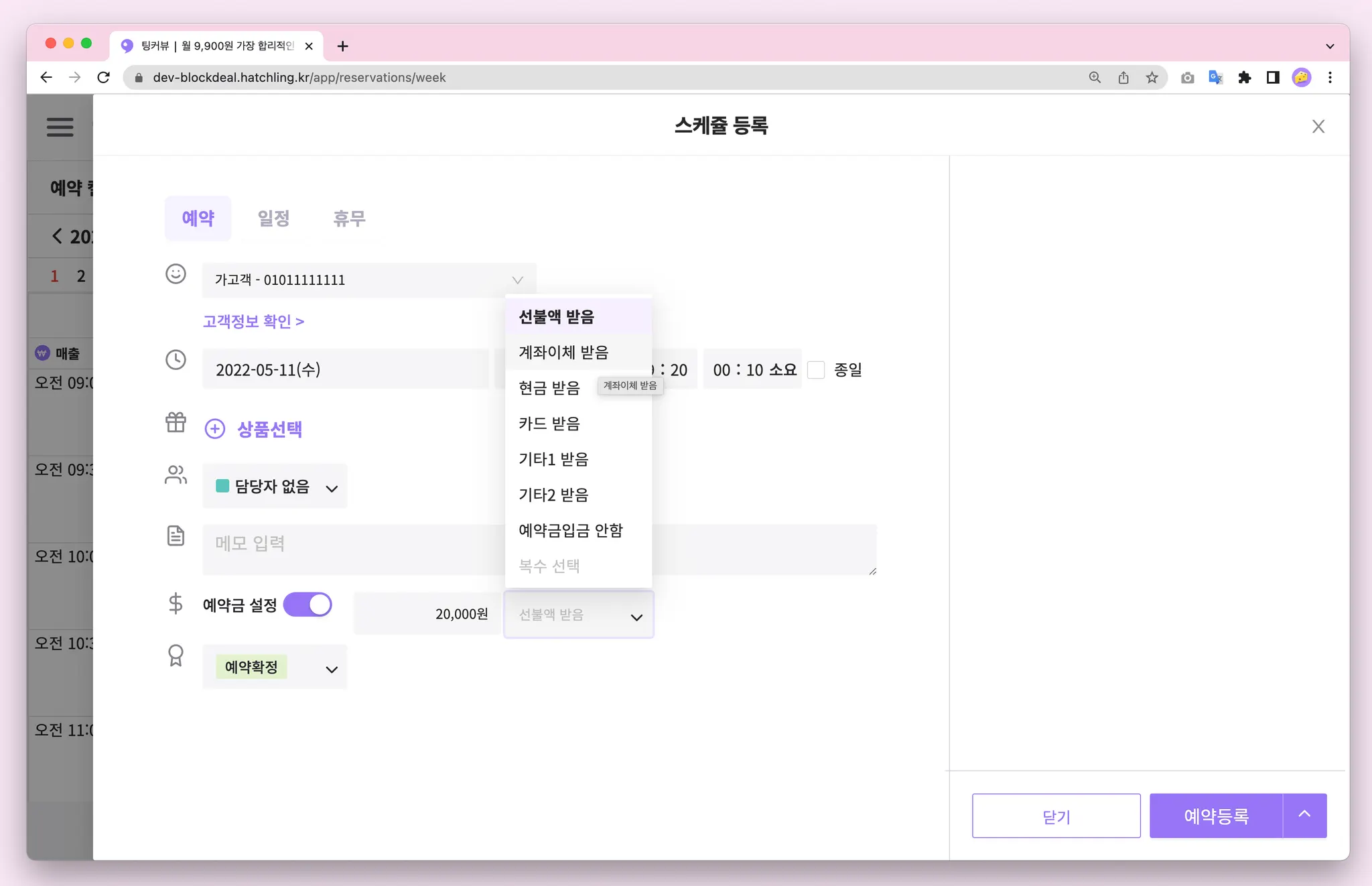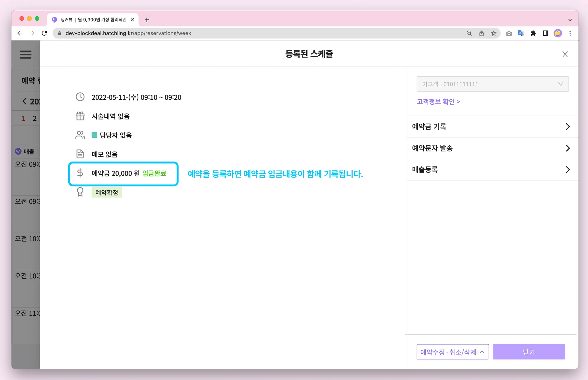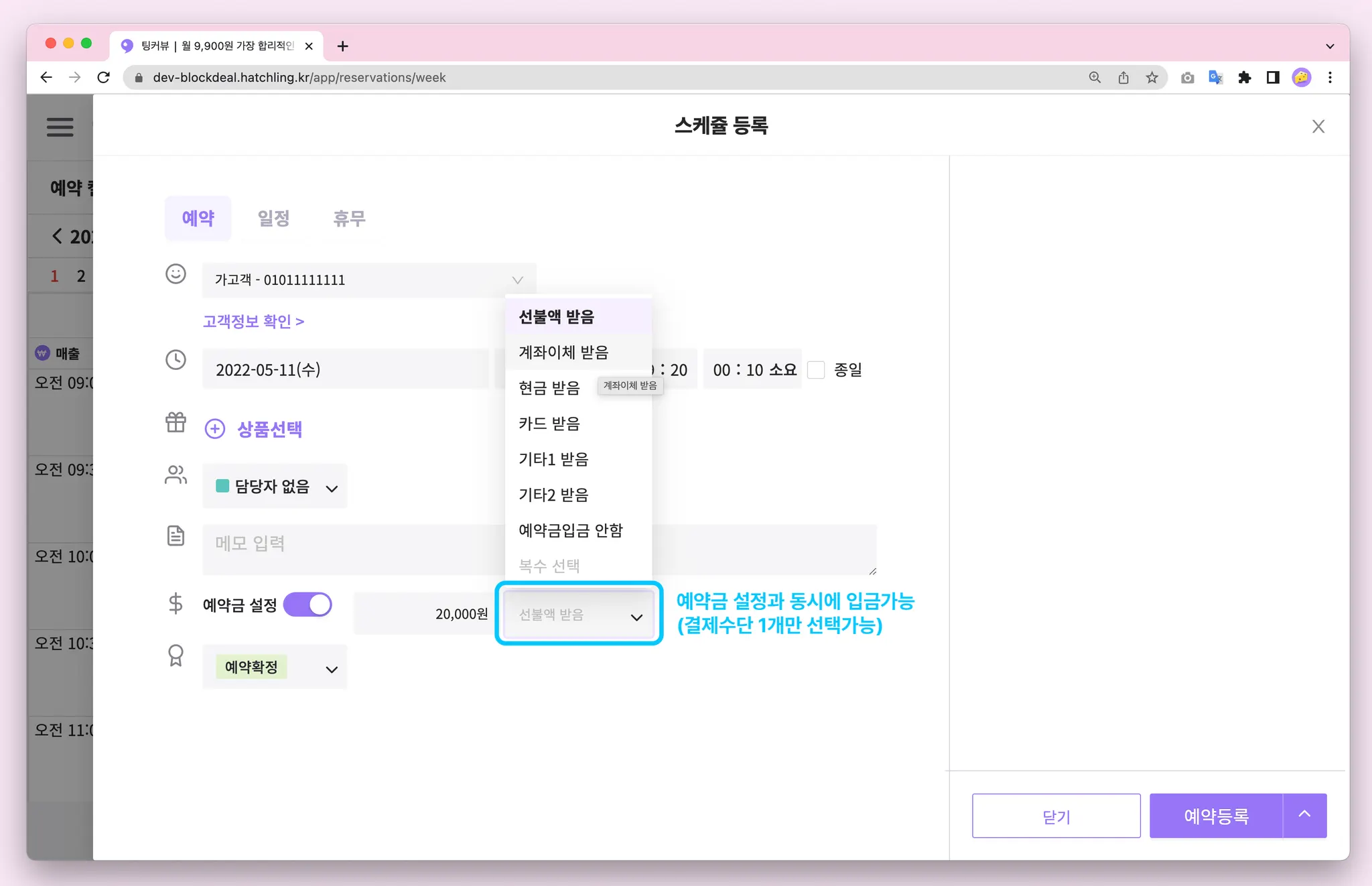 이제 예약금을 설정과 동시에 입금할 수 있어요! 예약등록 화면에서 예약금 설정 스위치를 ON으로 변경하고 예약금액을 입력한 후 결제수단을 선택해주세요. 예약등록을 완료하면 예약금 입금내용이 함께 기록됩니다