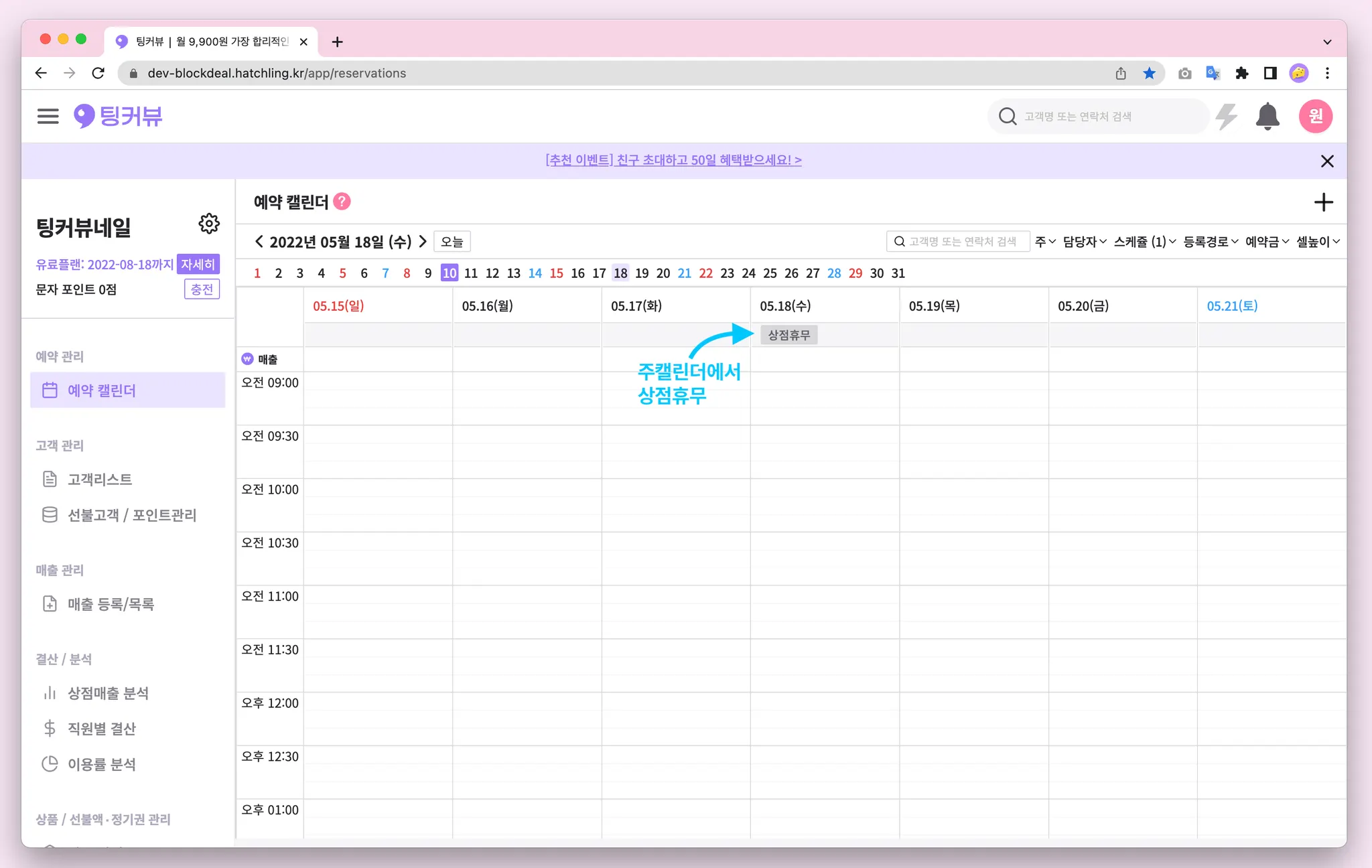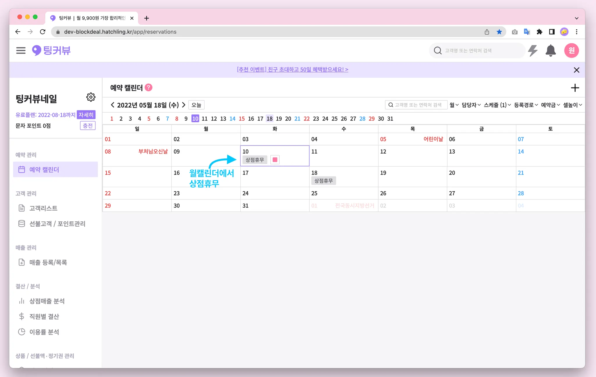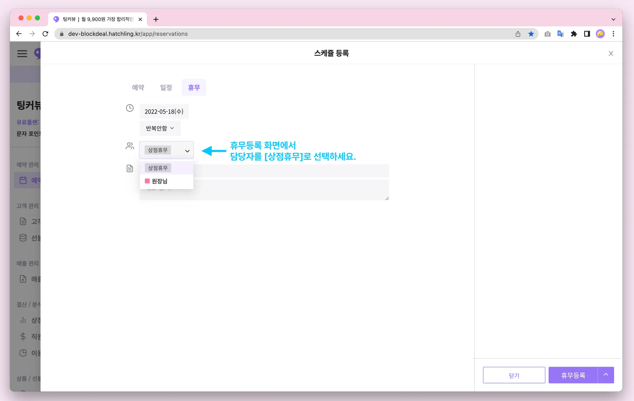 휴무를 등록할 때 담당자를 [상점휴무]로 선택해 등록해보세요! 등록된 상점휴무는 예약과 같이 마우스를 올려 휴무내용을 확인하거나 수정,삭제가 가능합니다