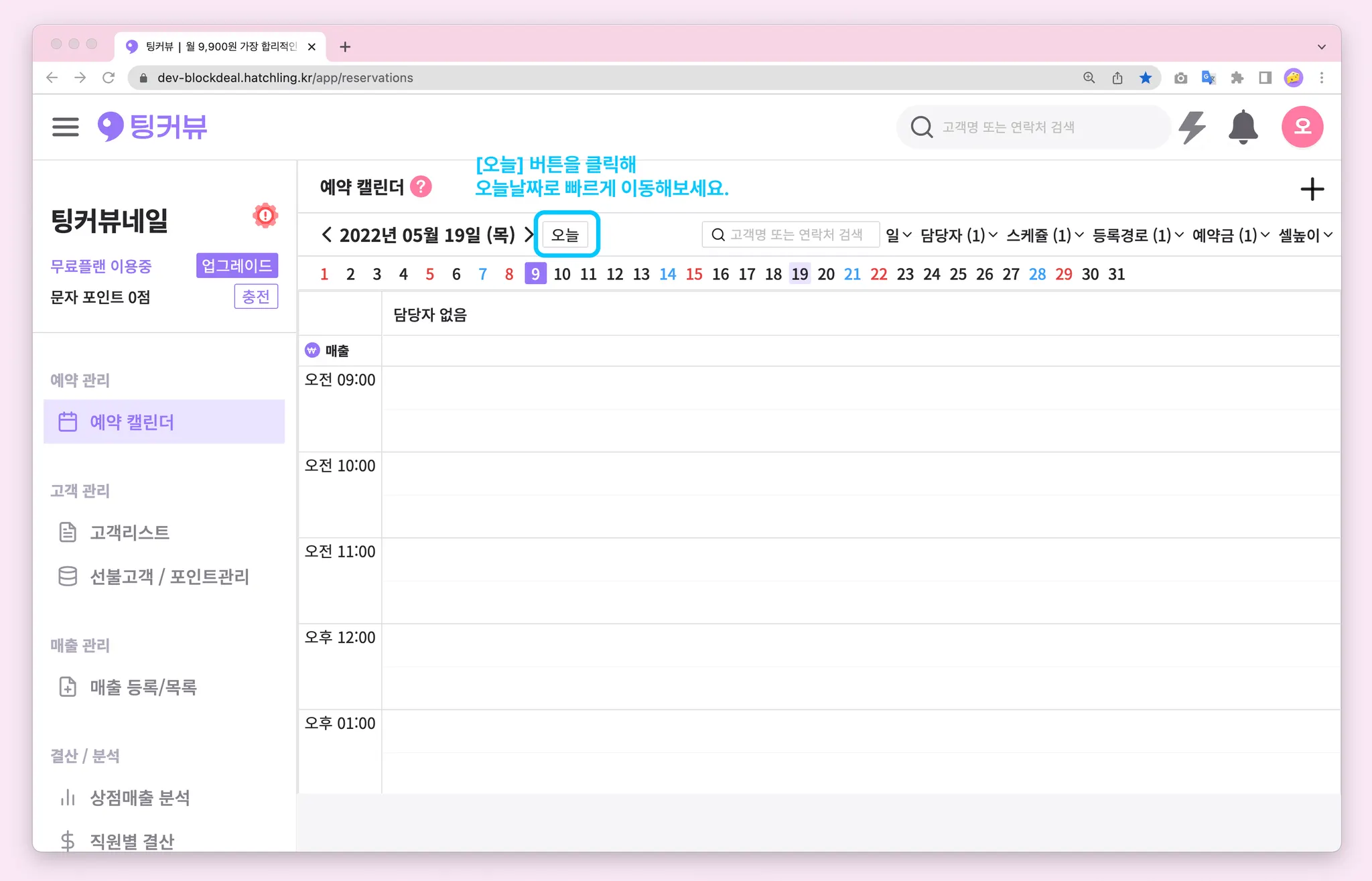 다른 날짜를 조회하다가도 빠르게 오늘 날짜로 이동할 수 있어요! 날짜 우측의 [오늘]버튼을 클릭하면 ‘오늘'날짜로 이동완료-!