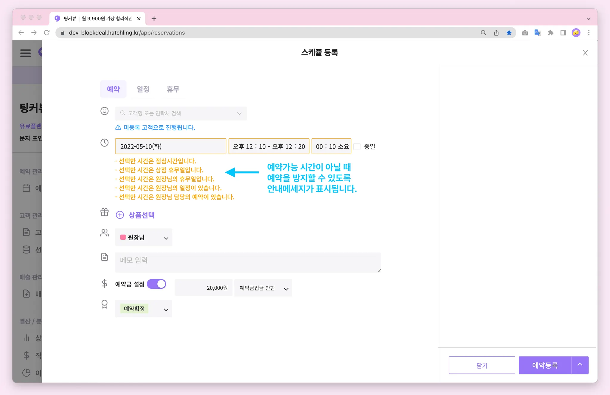 알고보니 예약이 불가능한 시간, 이미 스케줄이 있는 시간에 예약을 등록했던 적이 있으신가요? 이제 예약을 등록하기 전 동일한 시간에 다른 스케줄이 있는지, 예약이 가능한 시간인지 미리 확인하세요! 예약가능 시간이 아닌 경우 예약등록을 방지할 수 있도록 안내메세지가 표시됩니다.