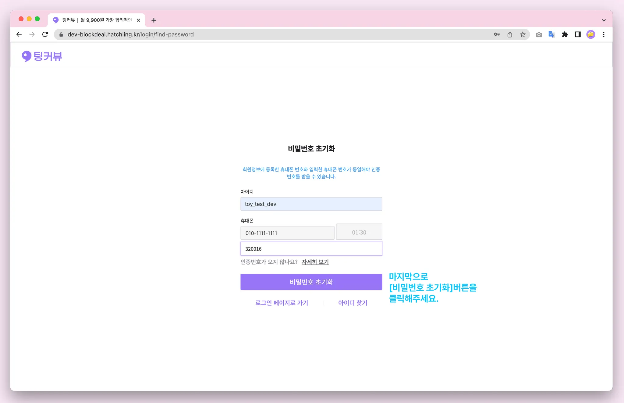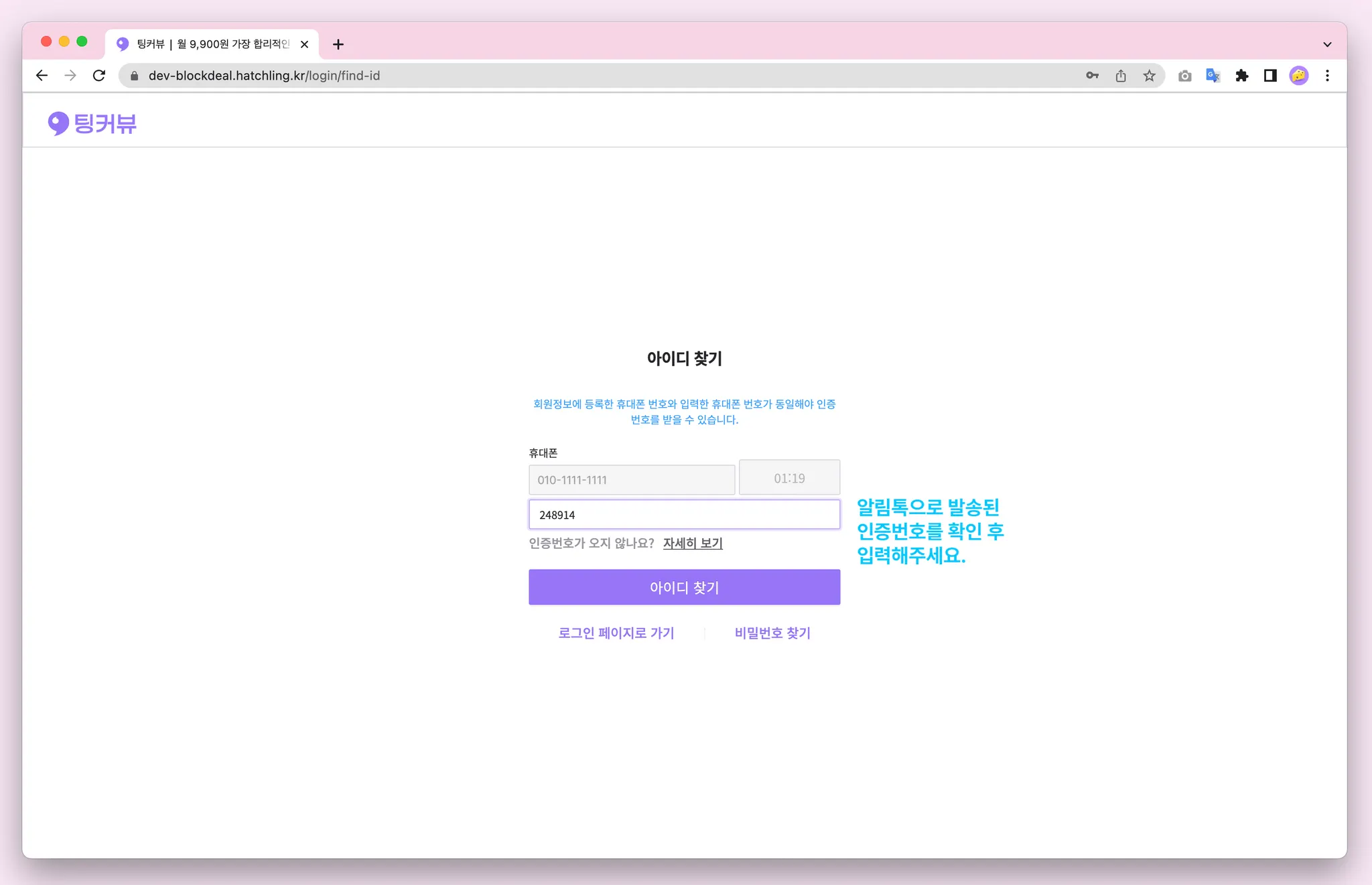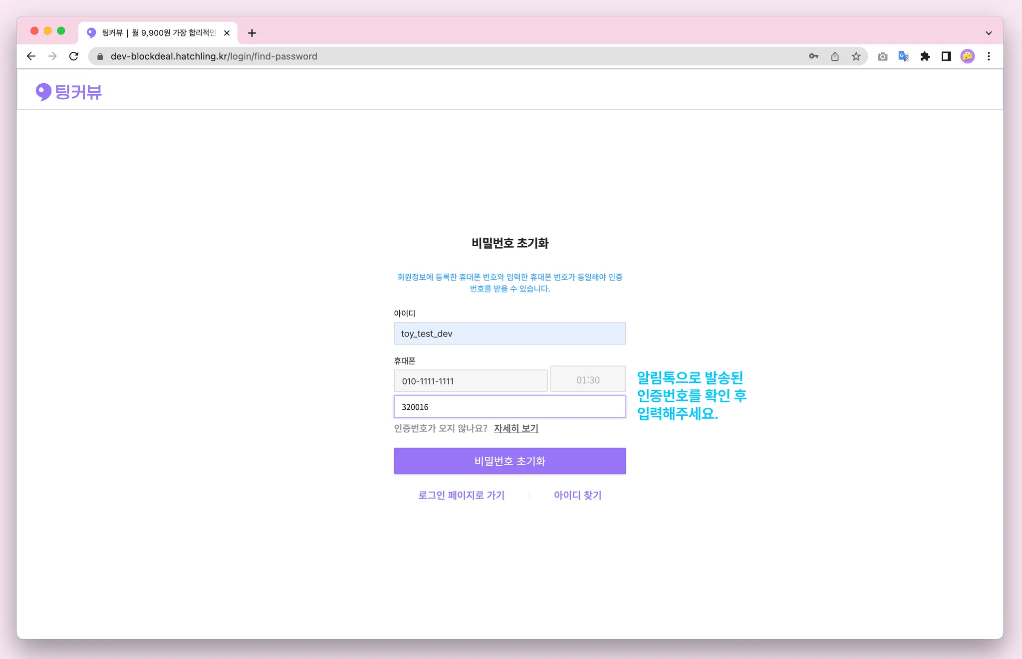 비밀번호를 잊으셨다면 비밀번호 찾기 기능을 이용해보세요! 아이디, 휴대폰번호 입력 후 카카오알림톡으로 발송된 인증번호 6자리를 입력해주세요! 비밀번호 초기화 완료~! 초기화된 비밀번호를 복사해 로그인해보세요