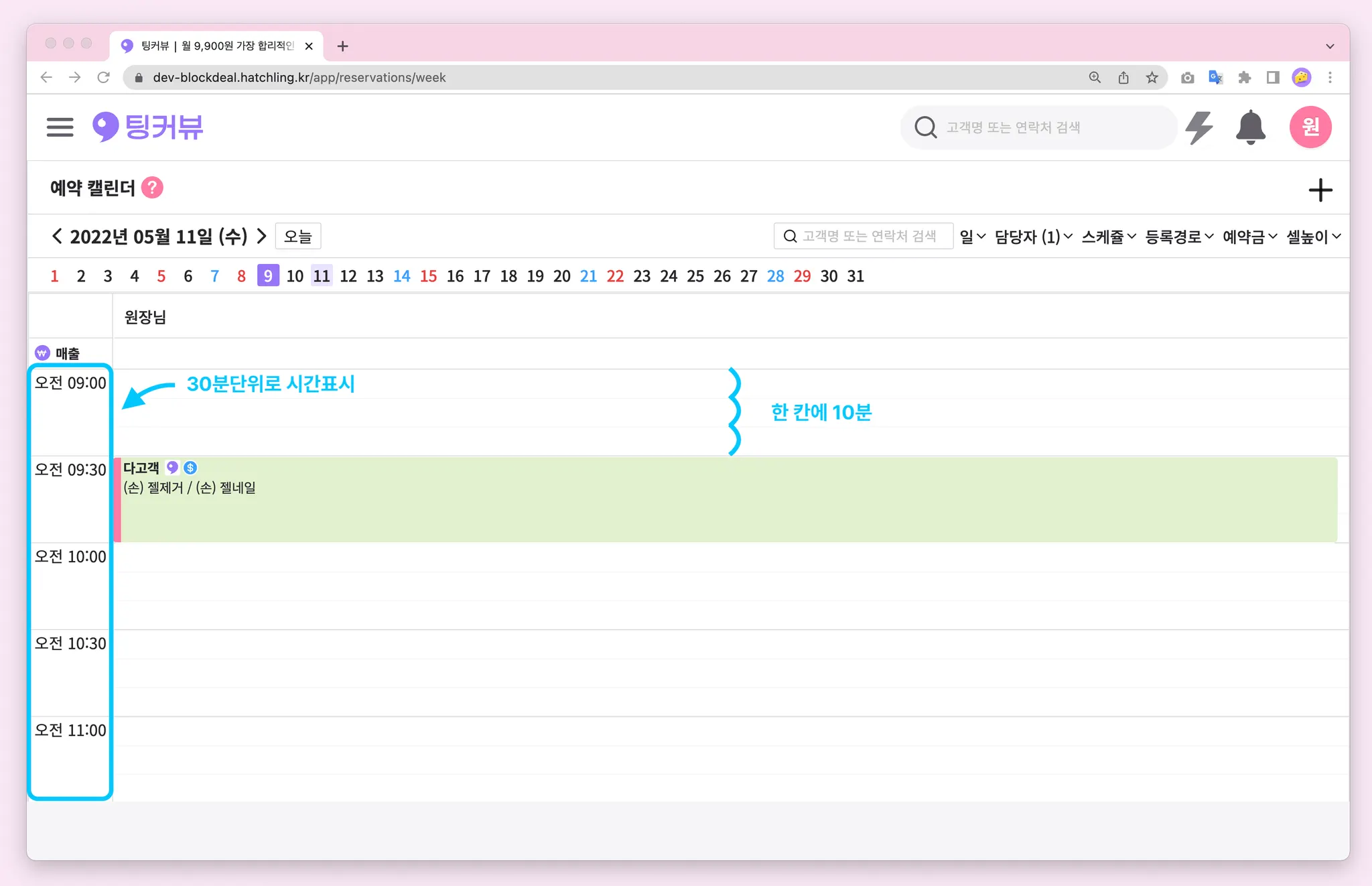 예약시간 간격 10분으로 설정시 캘린더 왼측시간이 30분단위로 표기되도록 변경되었어요! 10분당 한칸, 세칸마다 30분단위로 시간이 표시됩니다