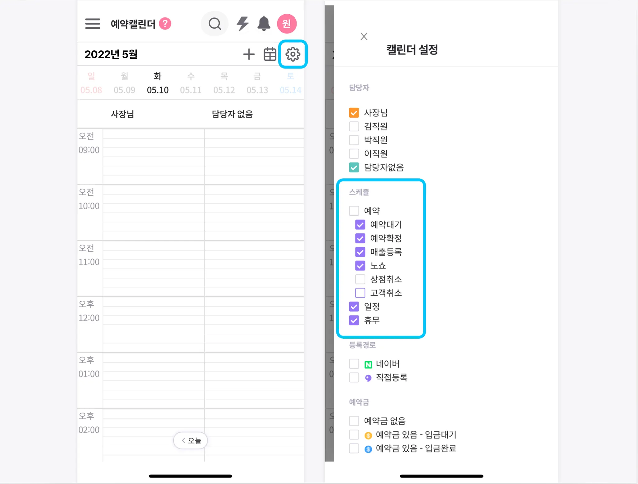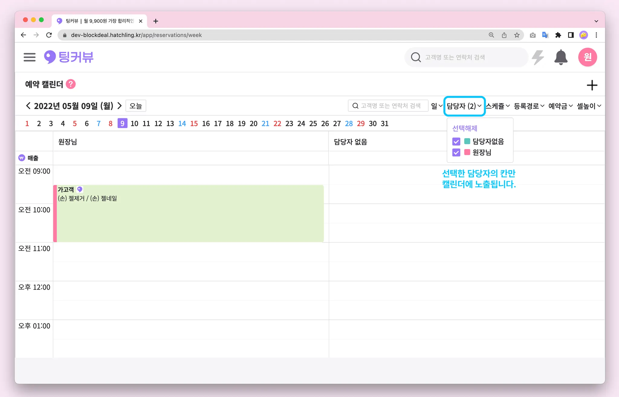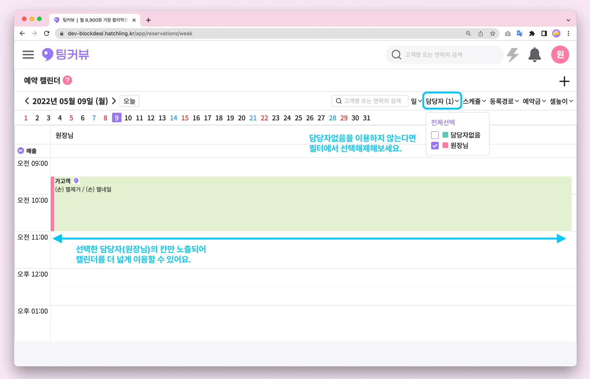 예약캘린더 담당자 필터가 개선되었어요! 이제 선택한 담당자의 칸만 예약캘린더에 노출된답니다! 필요한 담당자만 필터해 캘린더를 넓게 이용해 보세요