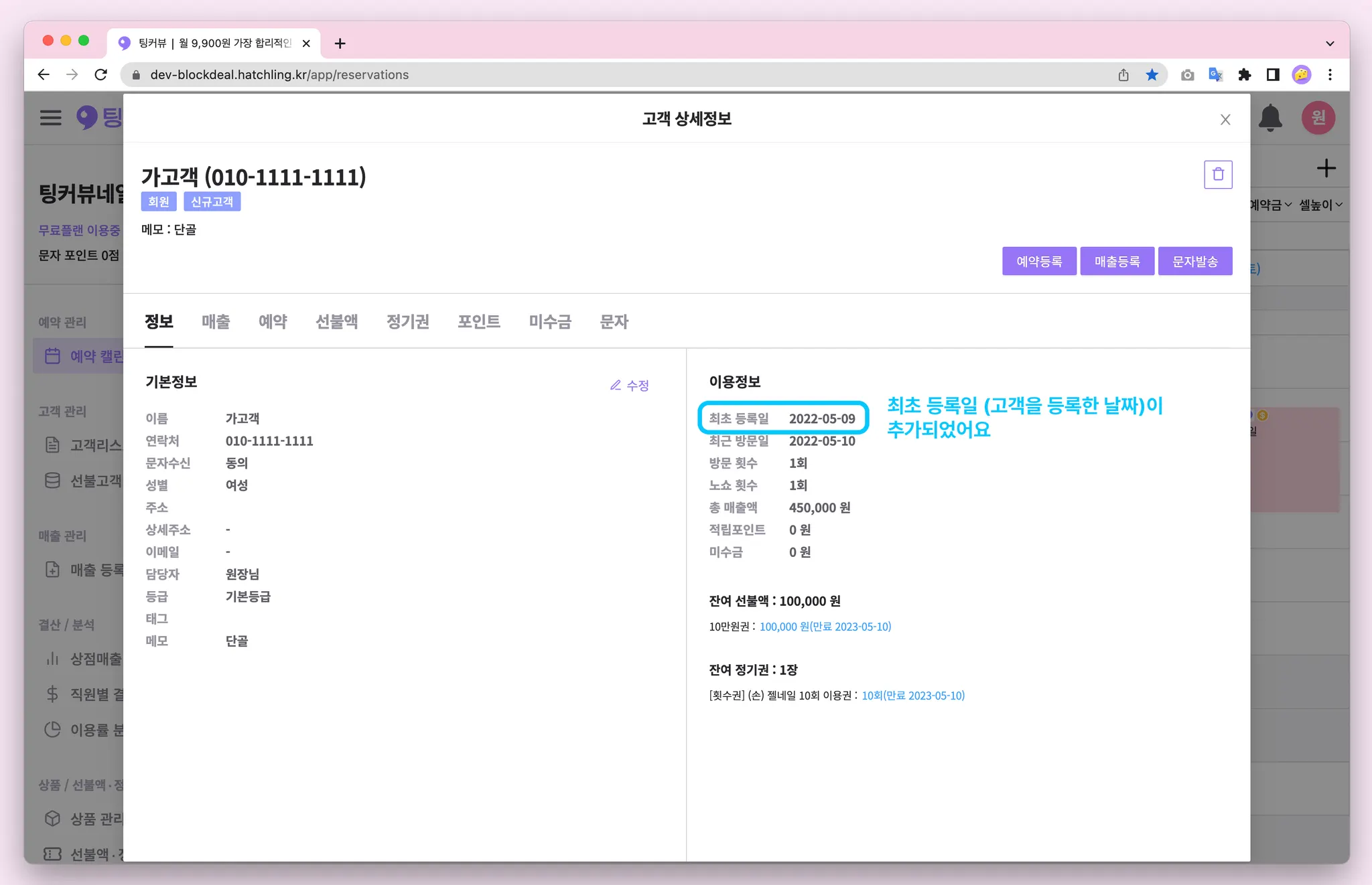 고객상세정보에 최초등록일이 추가되었어요! 고객을 등록한 날짜가 최초등록일로 기록됩니다