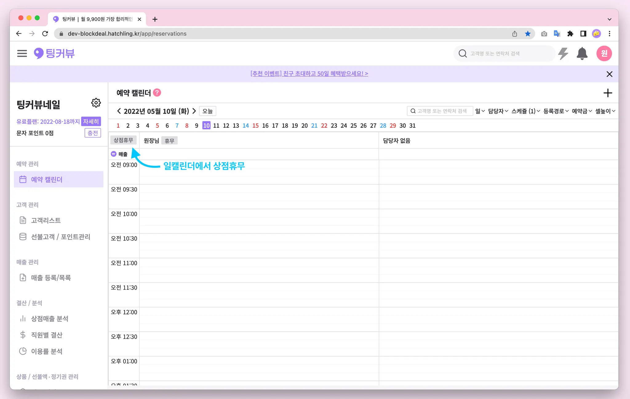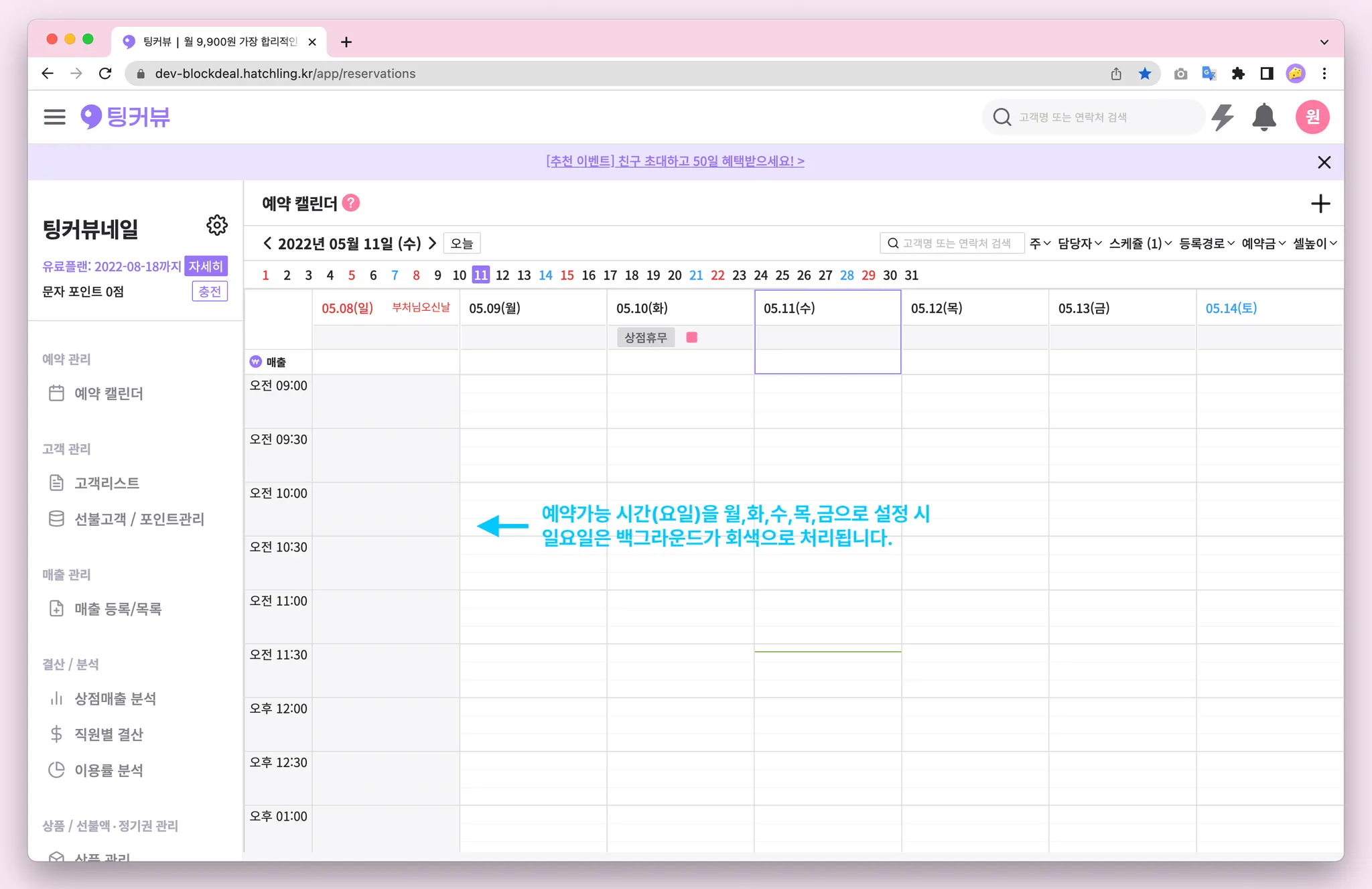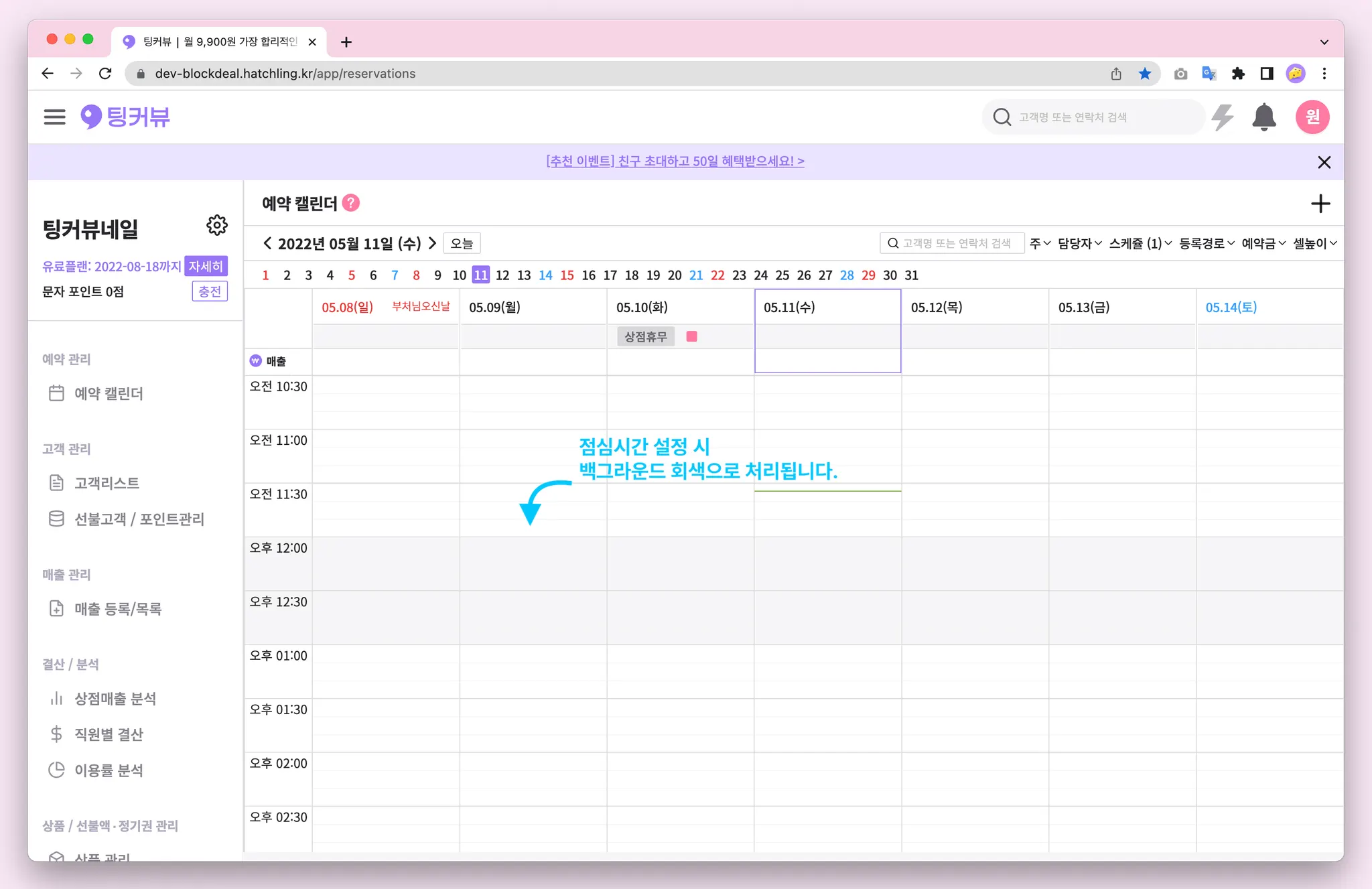 이제 캘린더에서 점심시간, 예약가능 외 시간을 한 눈에 확인해보세요! 예약가능 시간이 아닌 시간은 예약캘린더에서 백그라운드가 회색으로 처리됩니다