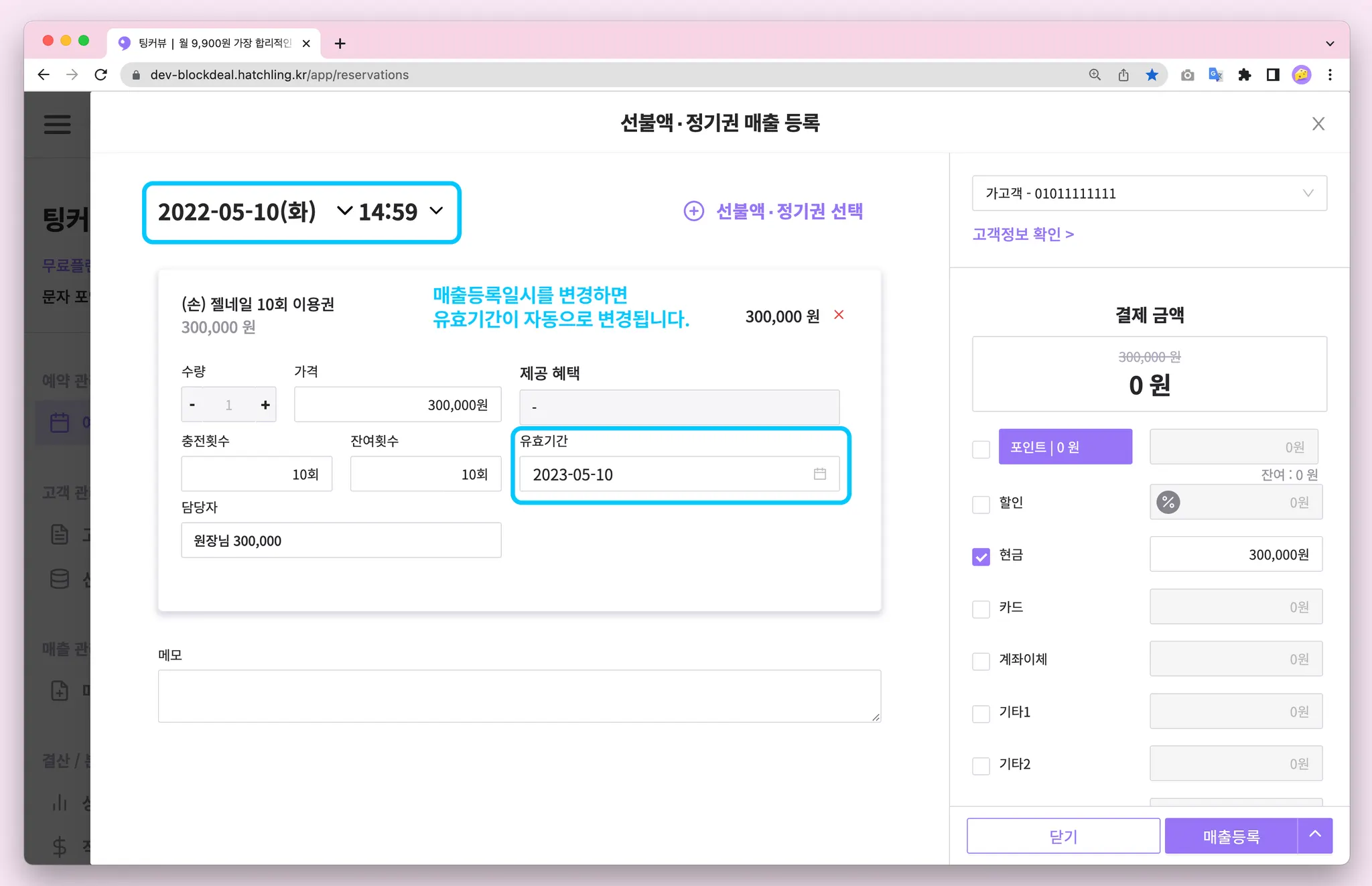 예를 들어 유효기간이 1년짜리인 선불액의 매출일시를 2022년 5월 10일로 조정하면 유효기간은 1년뒤인 2023년 5월 10일로 자동변경됩니다.