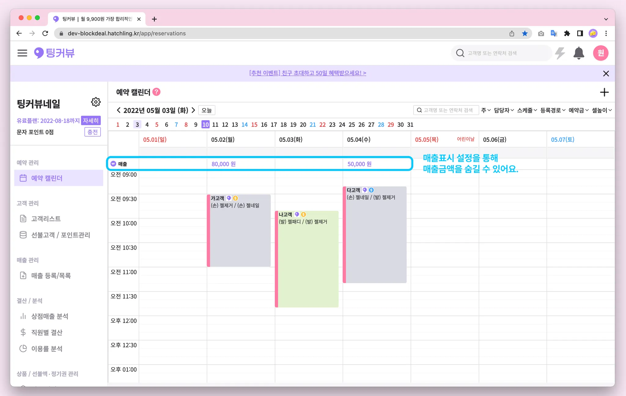 예약캘린더에 표시되는 매출금액, 고객이나 직원들에게 공개하기 불편하신가요? 그렇다면 매출표시 설정을 이용해보세요! 매출표시 설정을 변경하면 매출금액 대신 매출보기 버튼을 노출하거나, 매출액을 아예 숨길 수 있어요!
