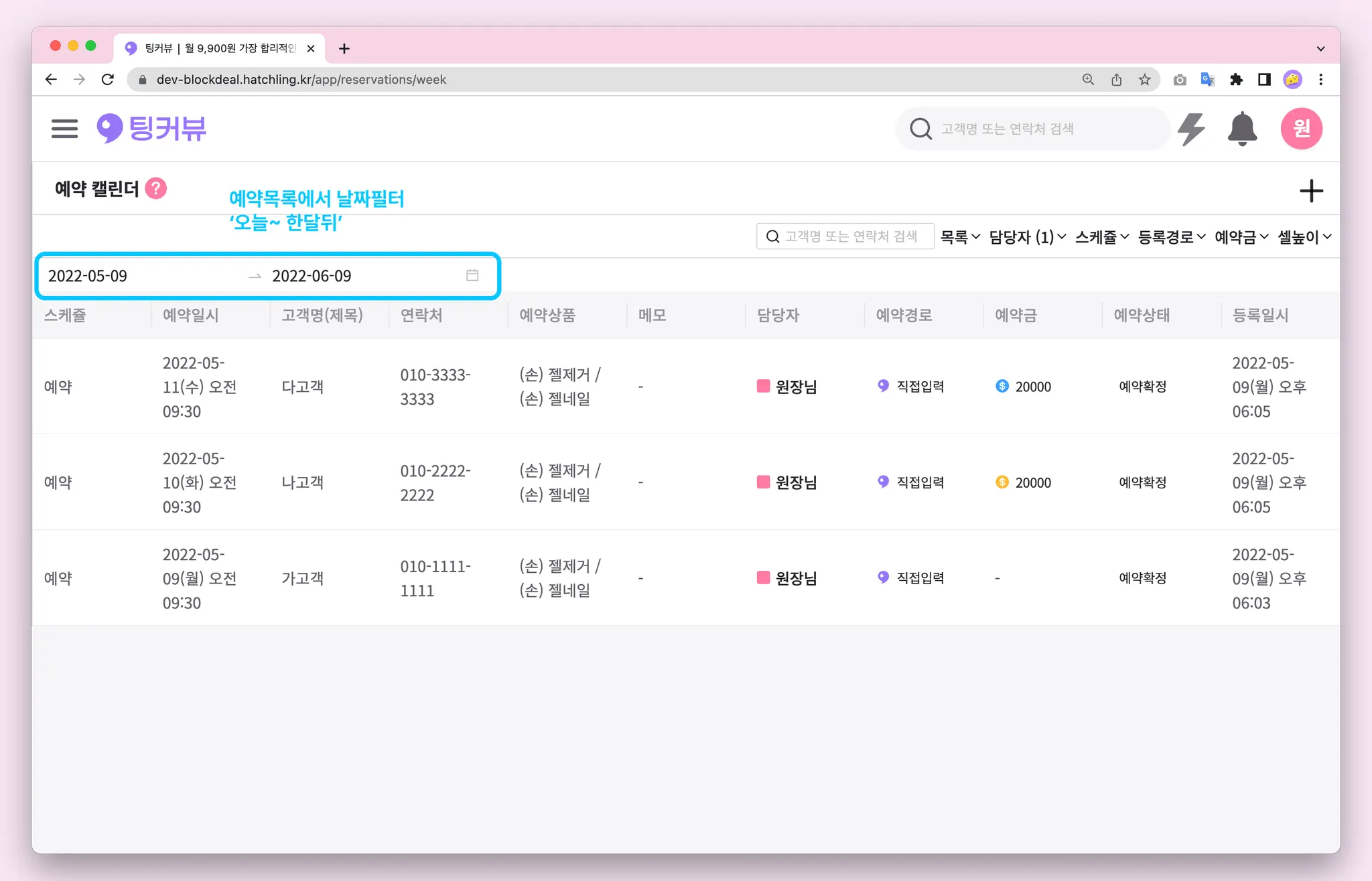 예약목록 날짜필터의 기본값이 ‘오늘~한달뒤'로 변경되었어요! 오늘 등록한 스케줄부터 앞으로의 스케줄을 빠르게 확인해보세요