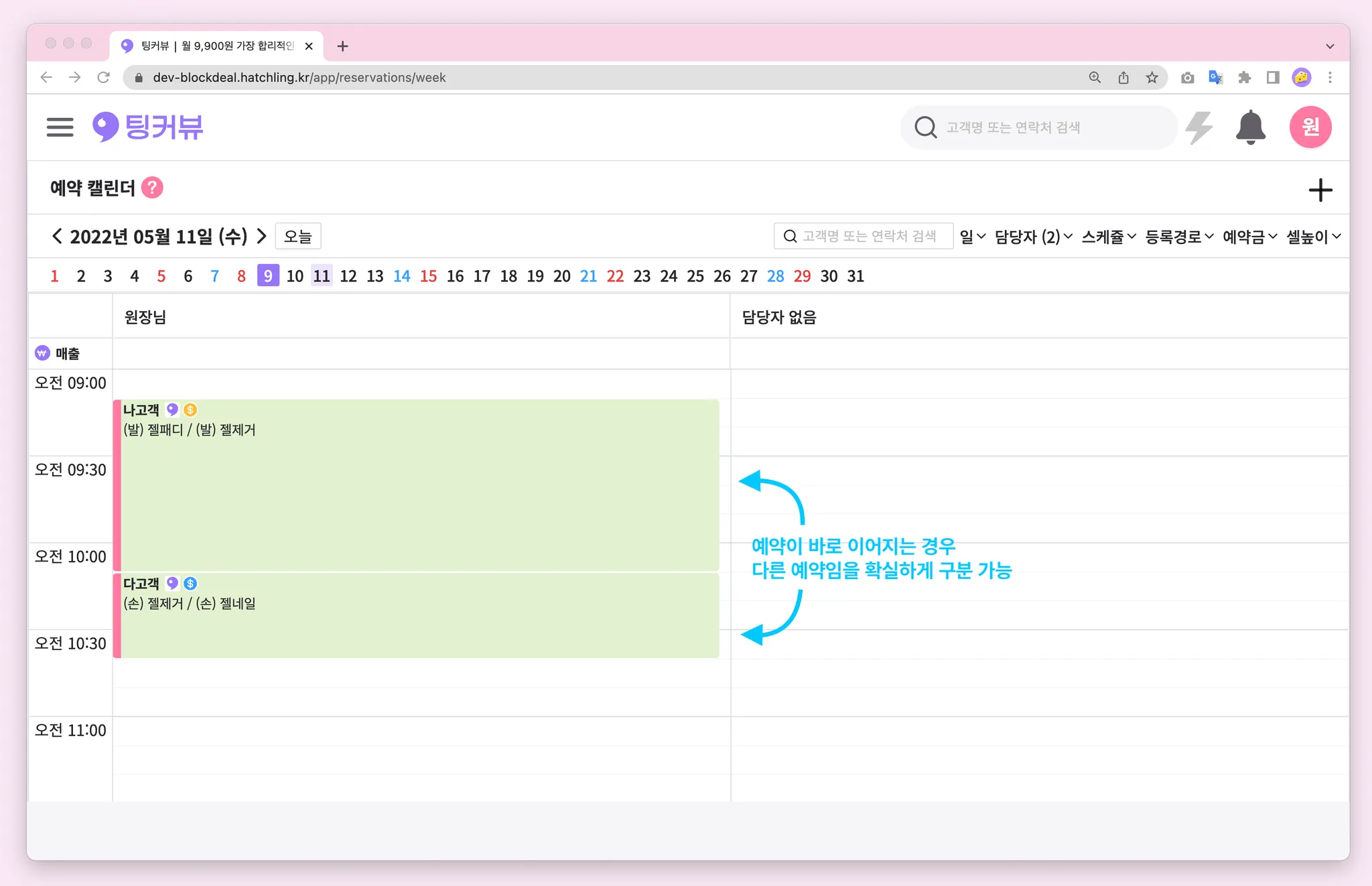 같은 색상의 예약이 연속되는 경우, 서로 다른 예약임을 구분가능하도록 개선되었어요!