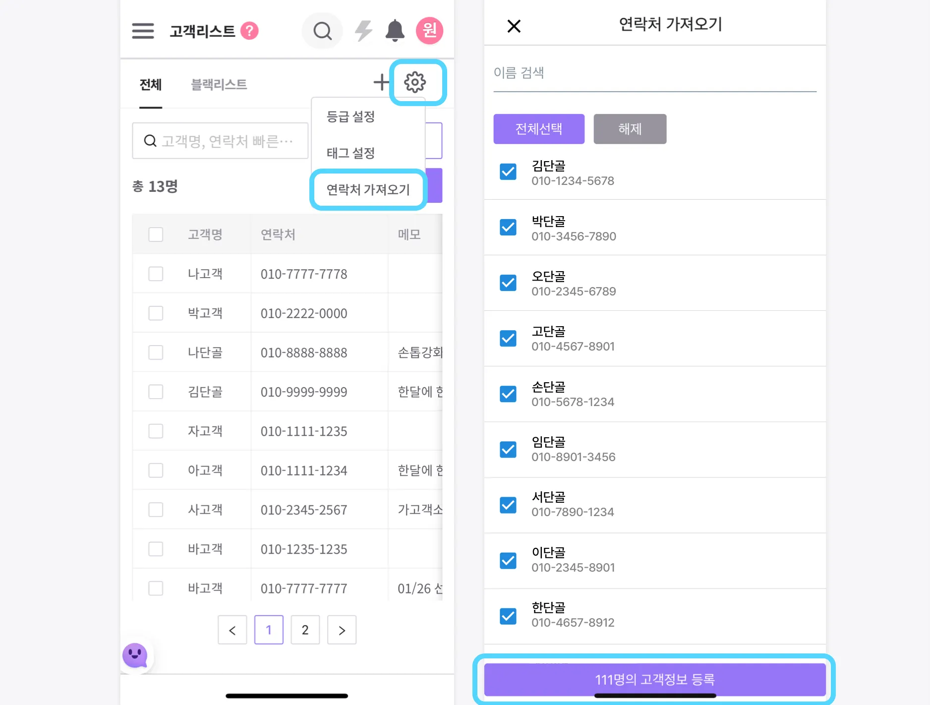 휴대폰에 등록된 고객연락처, 프로그램에 일일이 등록하기 번거로우셨죠? 이제 연락처 가져오기 기능을 이용해보세요