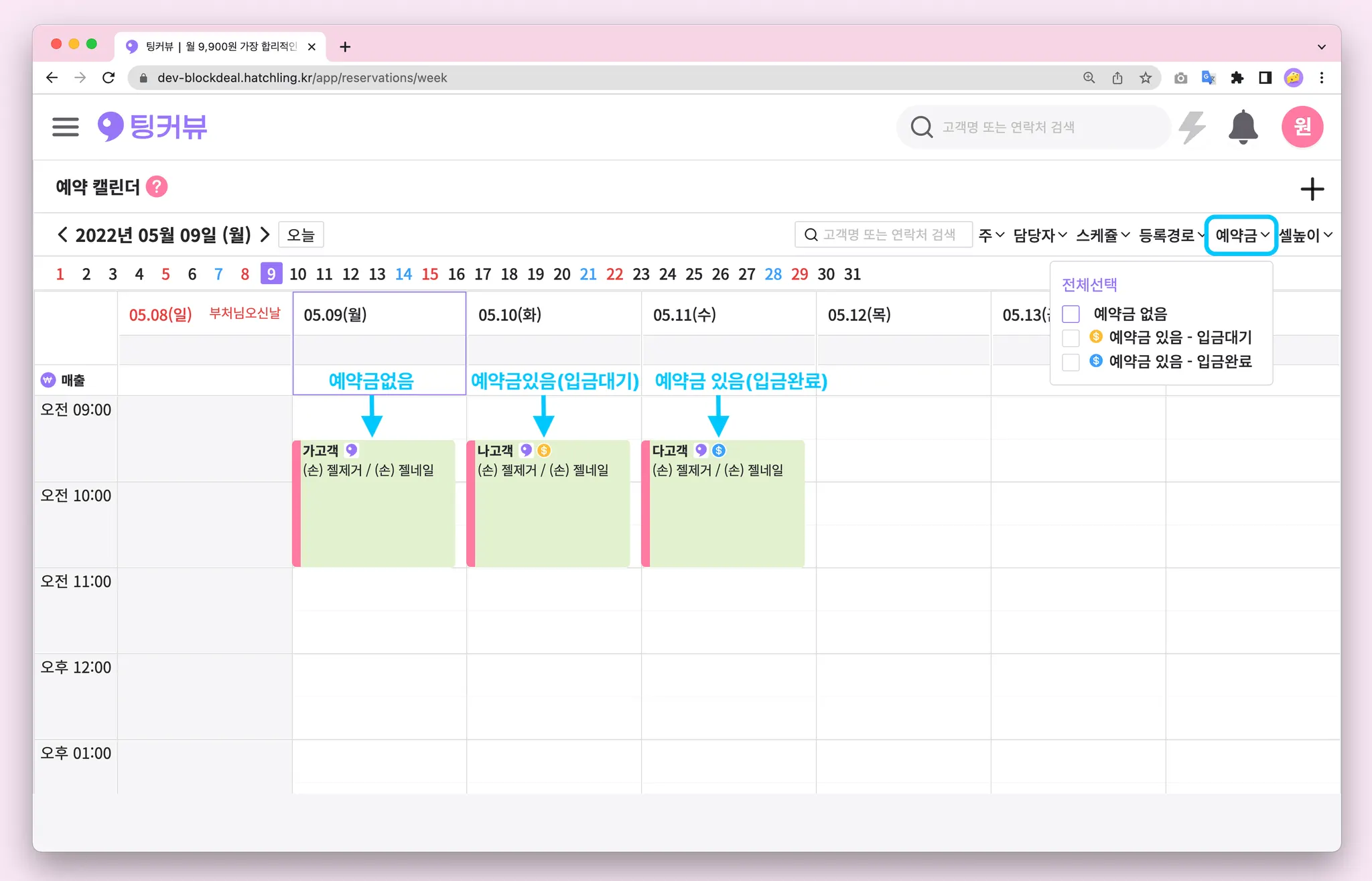 예약캘린더에 예약금 필터기능이 추가되었어요! 이제 예약금 있음/없음, 예약금 입금대기/입금완료에 따라 원하는 예약을 조회할 수 있어요!