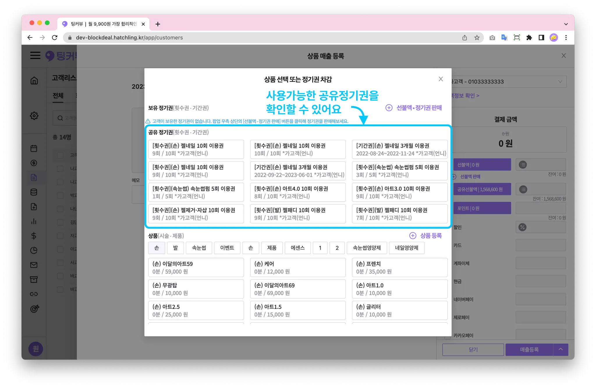상품과 연결된 사용가능한 공유정기권이 있는 경우, 상품카드 내에 ‘정기권차감’ 을 클릭해 공유정기권을 차감할 수 있어요!
