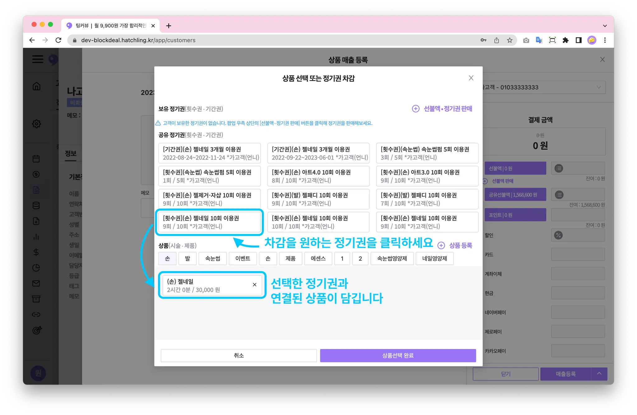 고객연결 후 선불액∙정기권을 공유했다면? 상품을 결제할 때 공유받은 선불액∙정기권을 이용해 차감결제를 할 수 있어요!