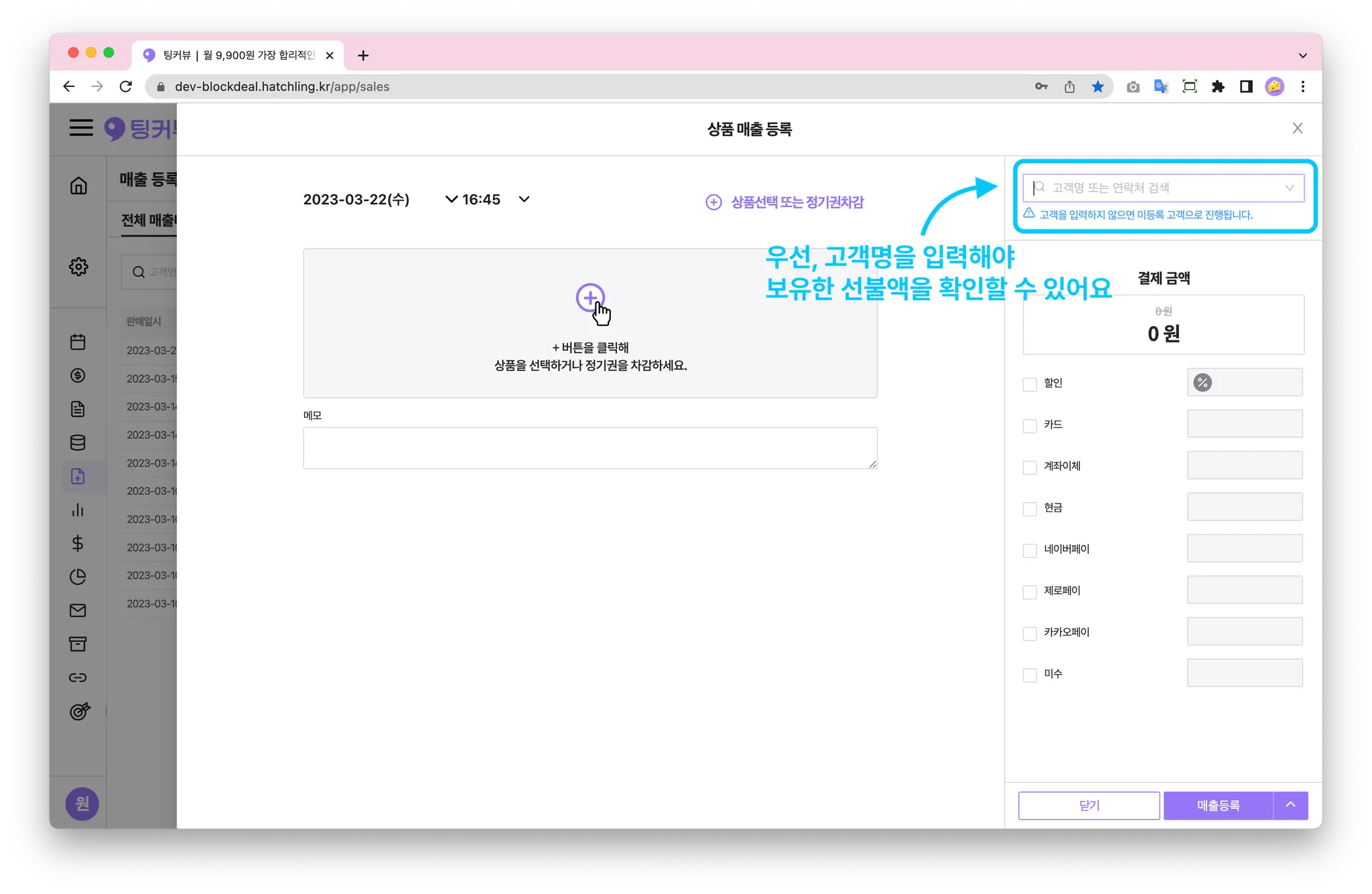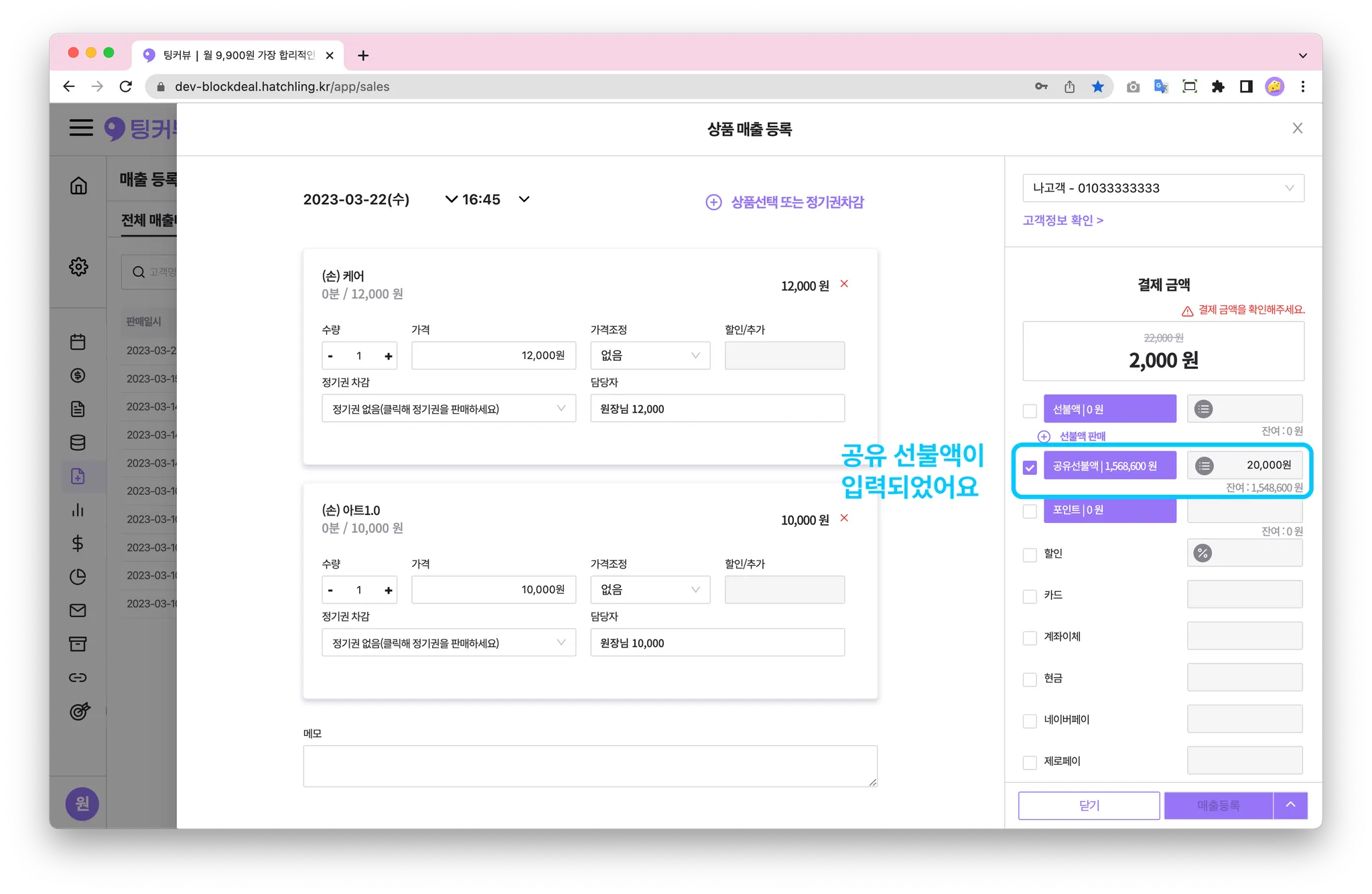 [매출등록]버튼을 클릭하면 선불액차감 결제 완료-!