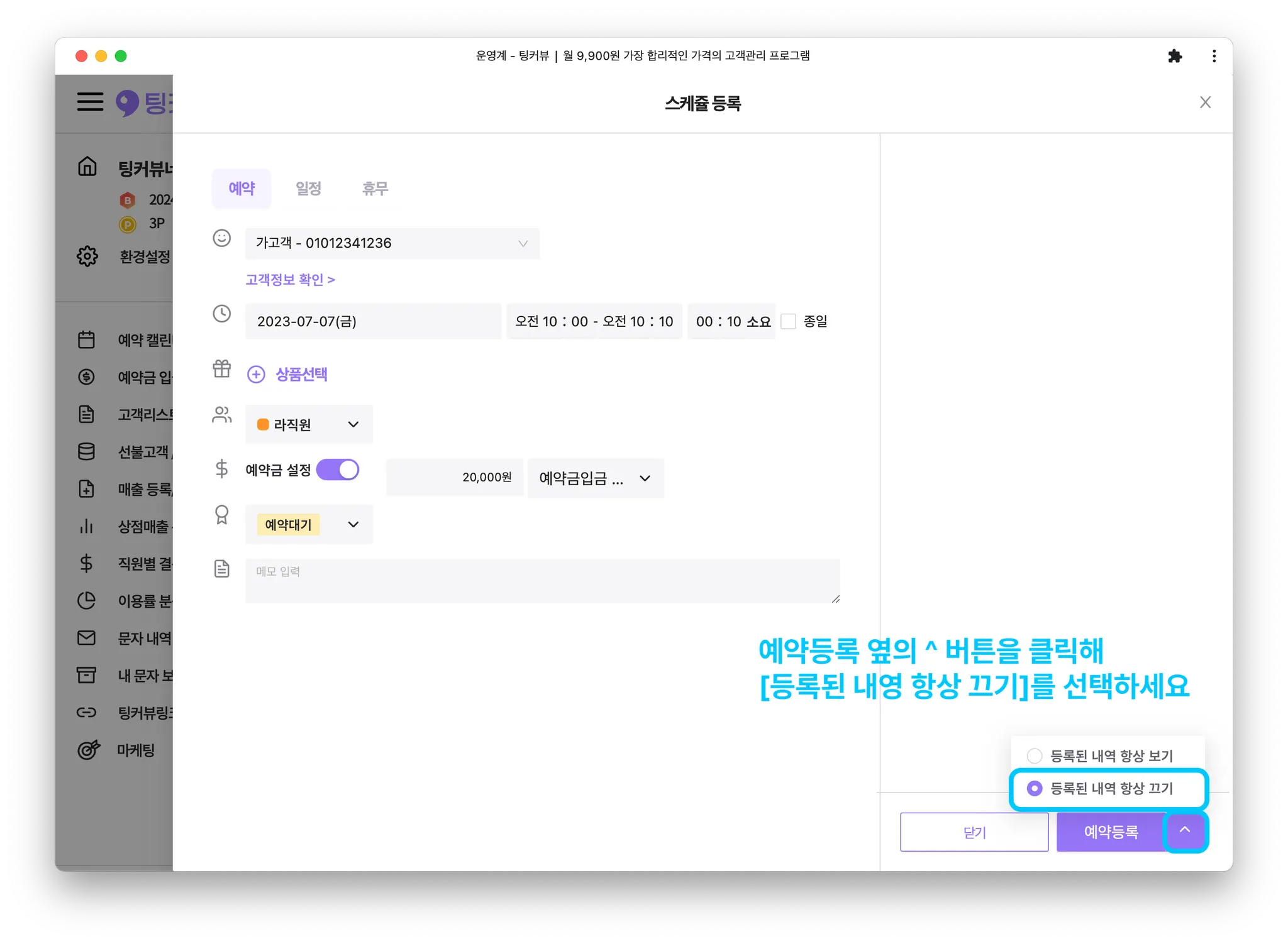 예약등록 후 항상보는 등록된 예약화면! on/off 기능을 이용하면 매번 확인하고 ‘닫기'버튼을 누르지 않아도 돼요. 예약등록 화면에서 예약등록버튼 옆의 ^ 아이콘을 클릭해 [등록된 내역 항상 끄기] 를 클릭해주세요.