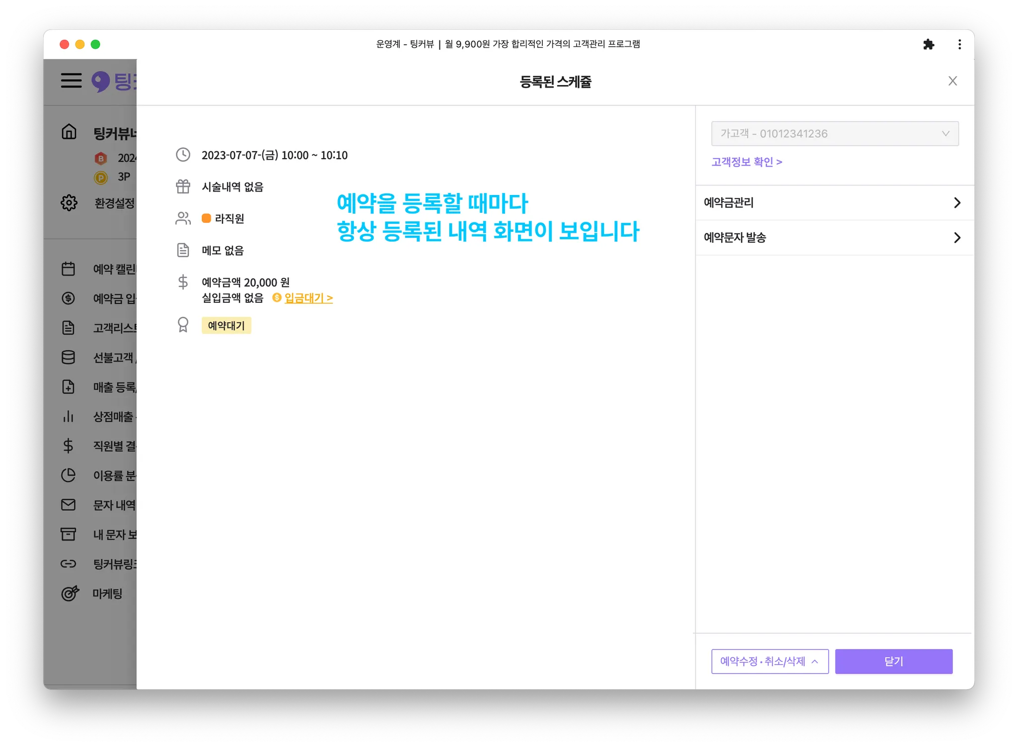 예약등록 후 항상 보이는 등록된 내역 화면! 매번 ‘닫기’ 버튼을 누르느라 번거로우셨나요? 등록된 내역 항상 끄기 기능을 이용하면 더이상 등록된 내역창을 확인하지 않아도 돼요.