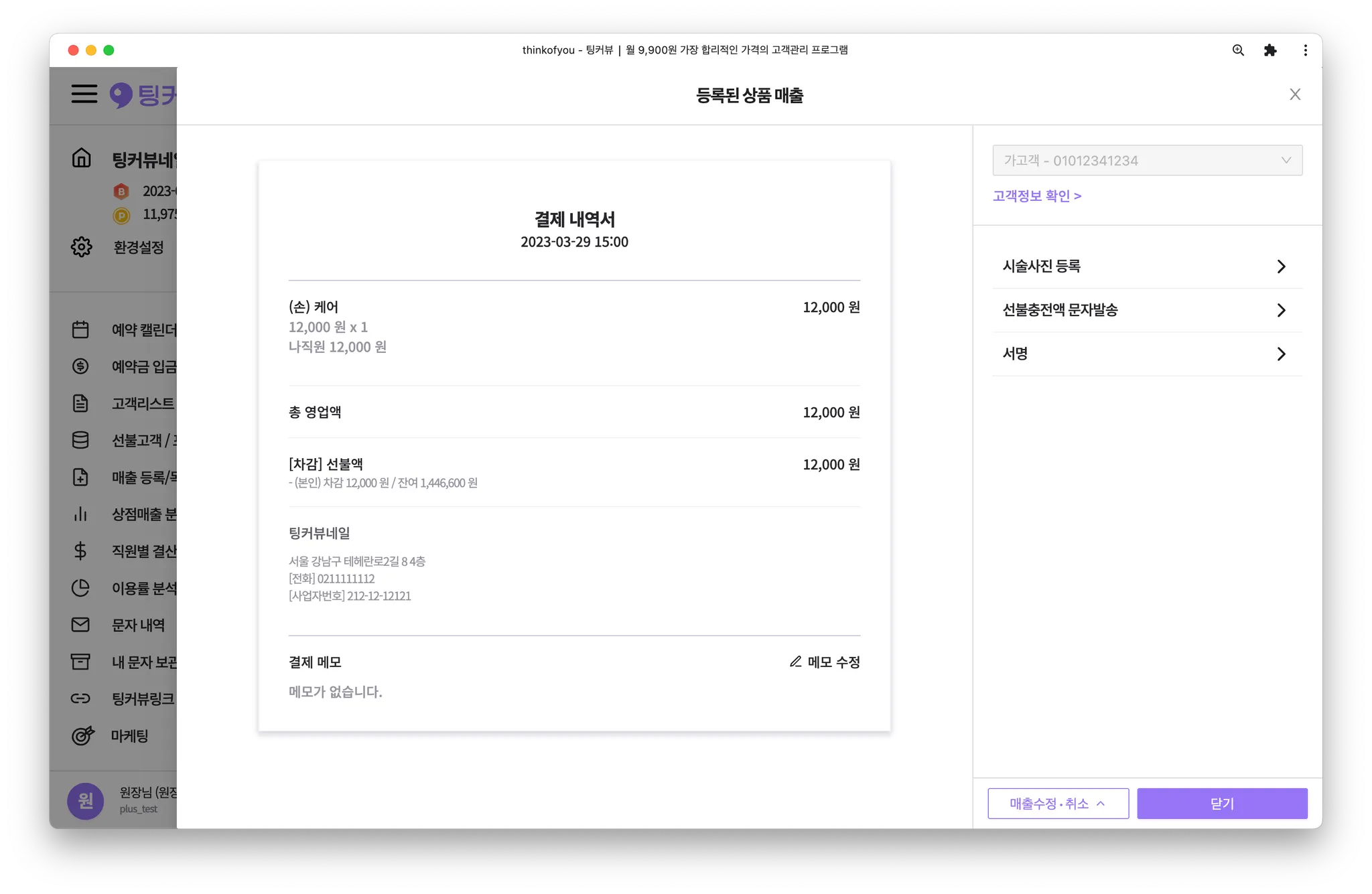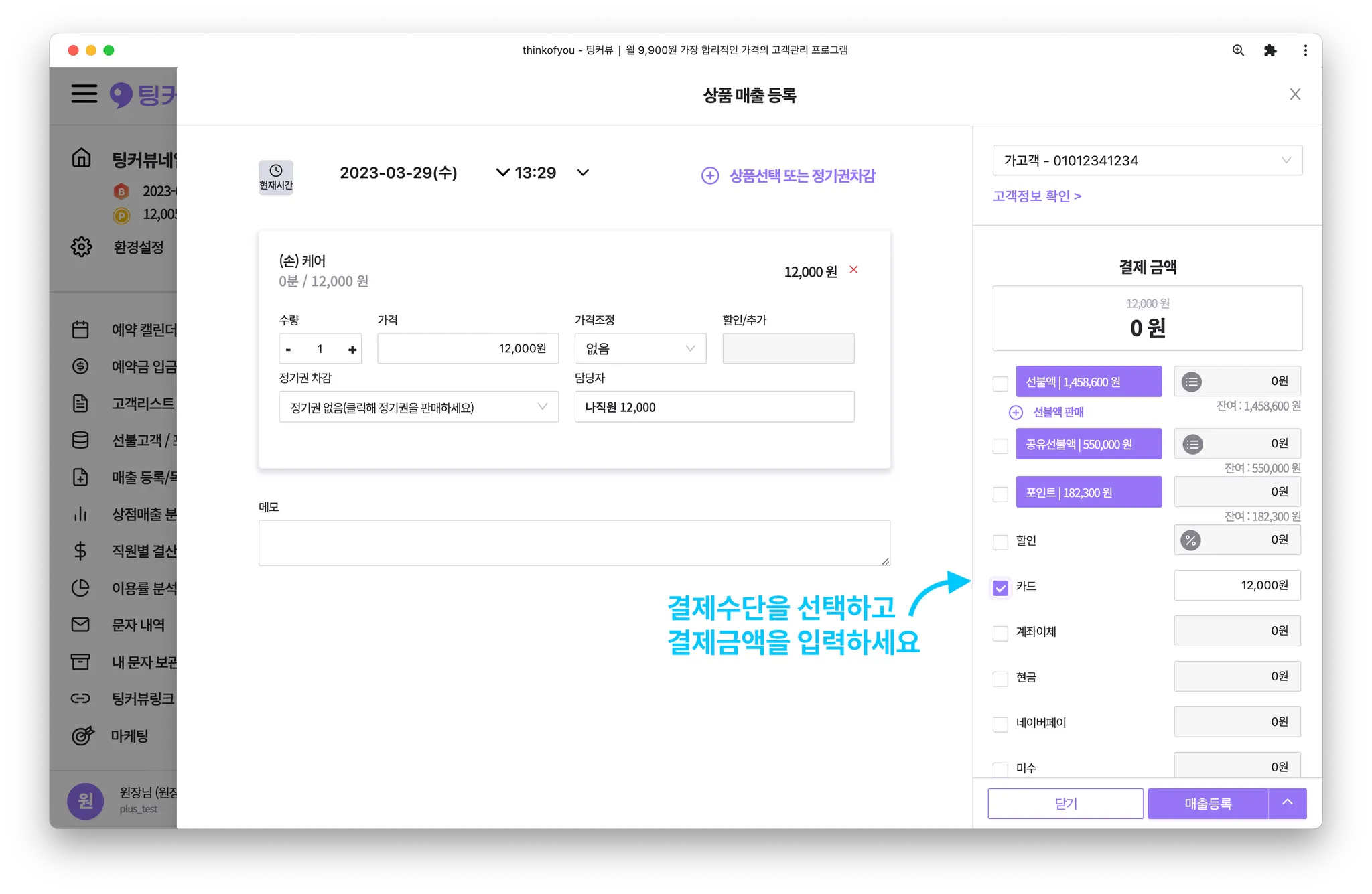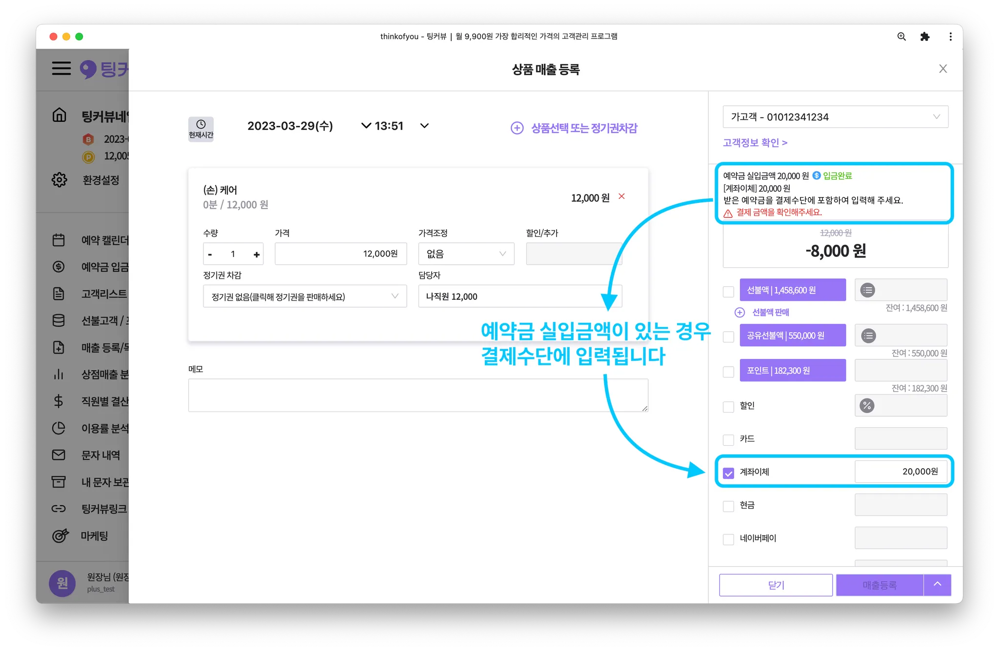 예약금 실입금액이 있을 경우, 결제수단에 자동으로 입력됩니다. 실입금액을 제외한 결제금액이 있다면 추가로 입력해주세요!
