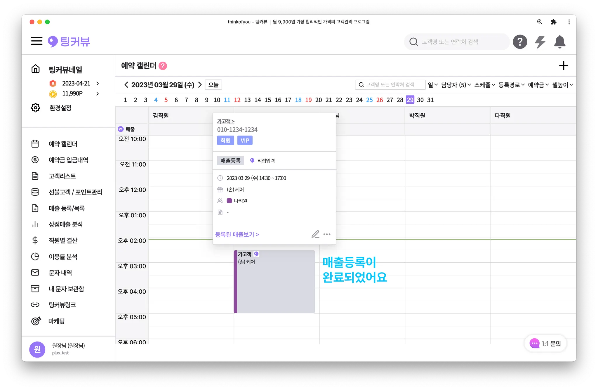 매출등록이 완료된 예약에 마우스를 올려 예약툴팁을 띄워주세요.