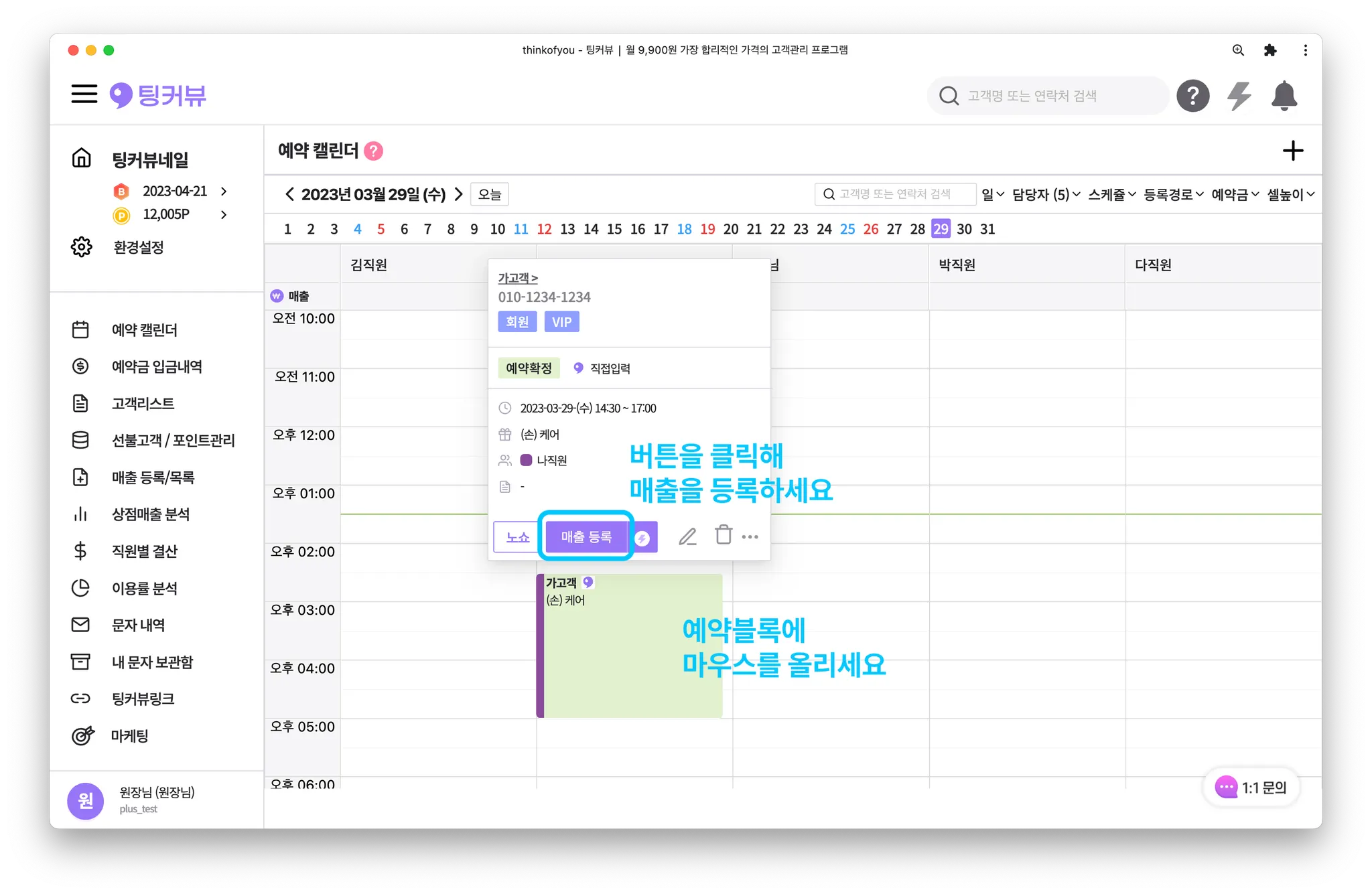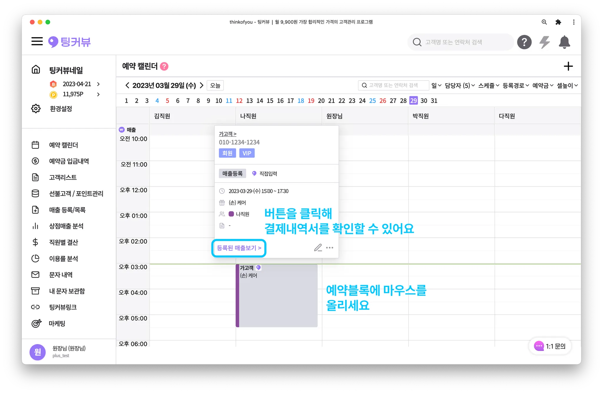 매출등록을 원하는 예약에 마우스를 올려 예약툴팁을 띄워주세요