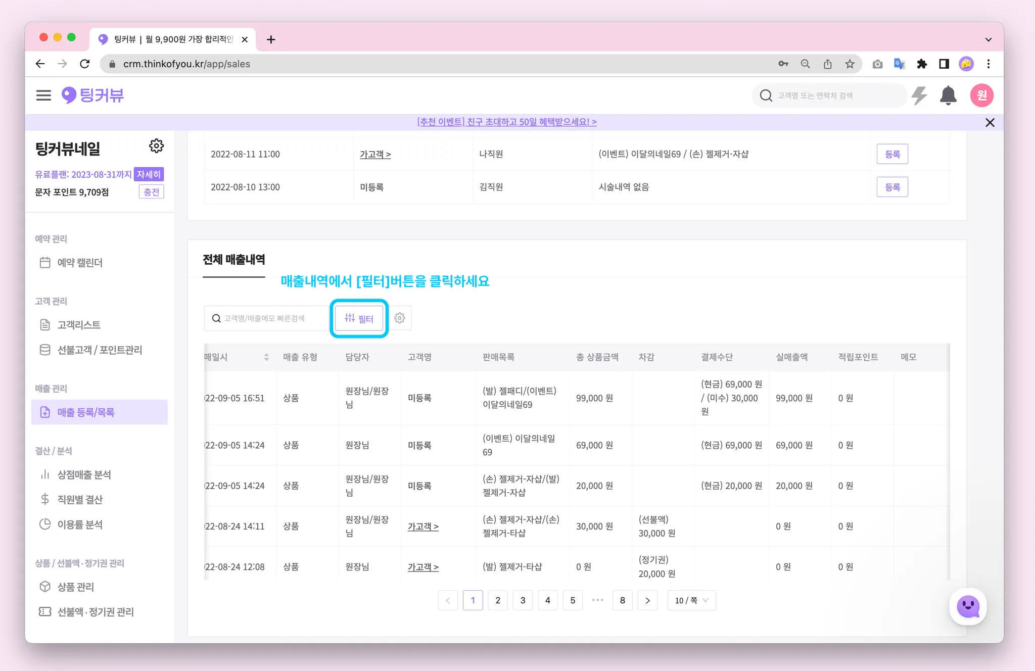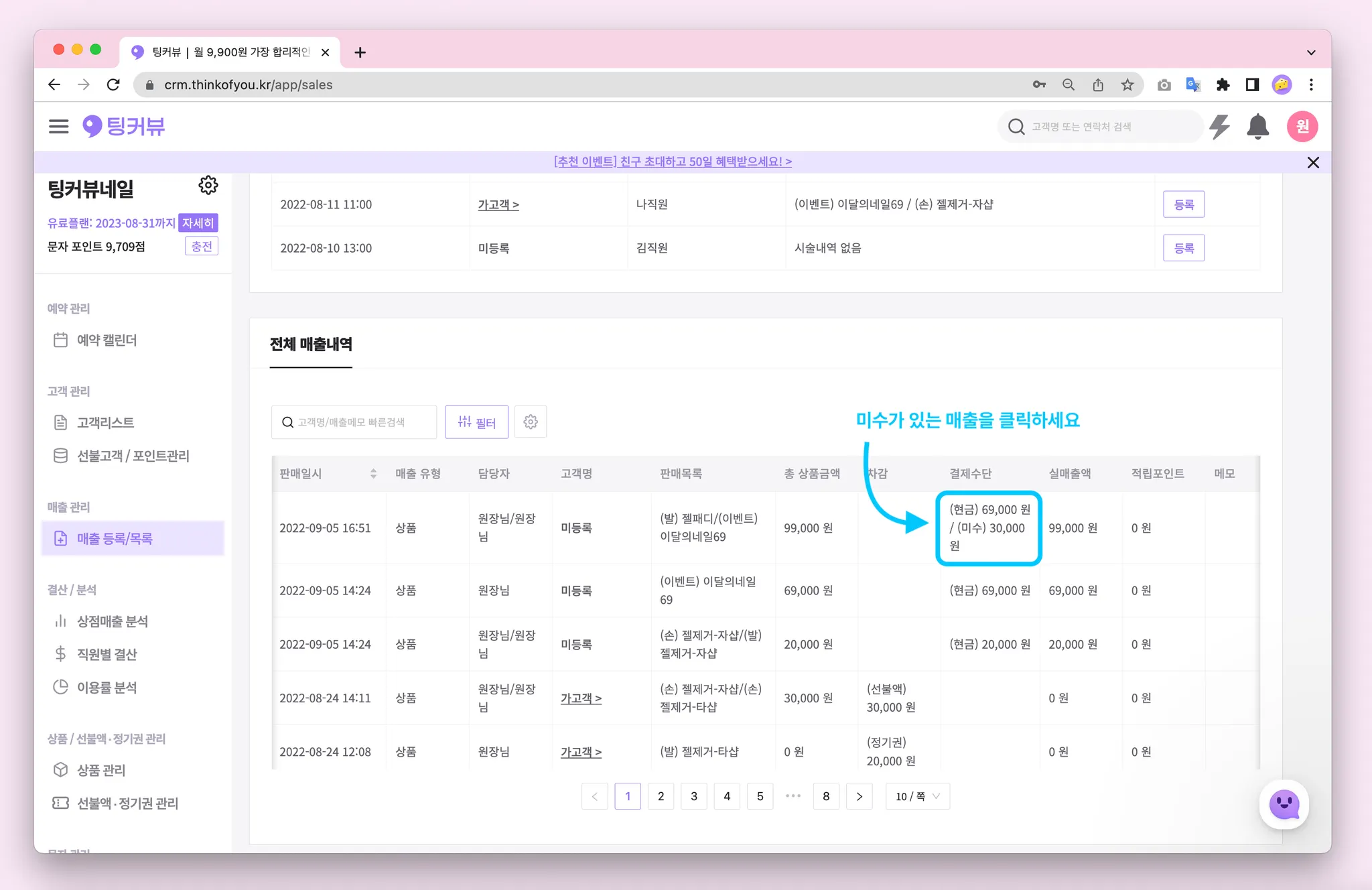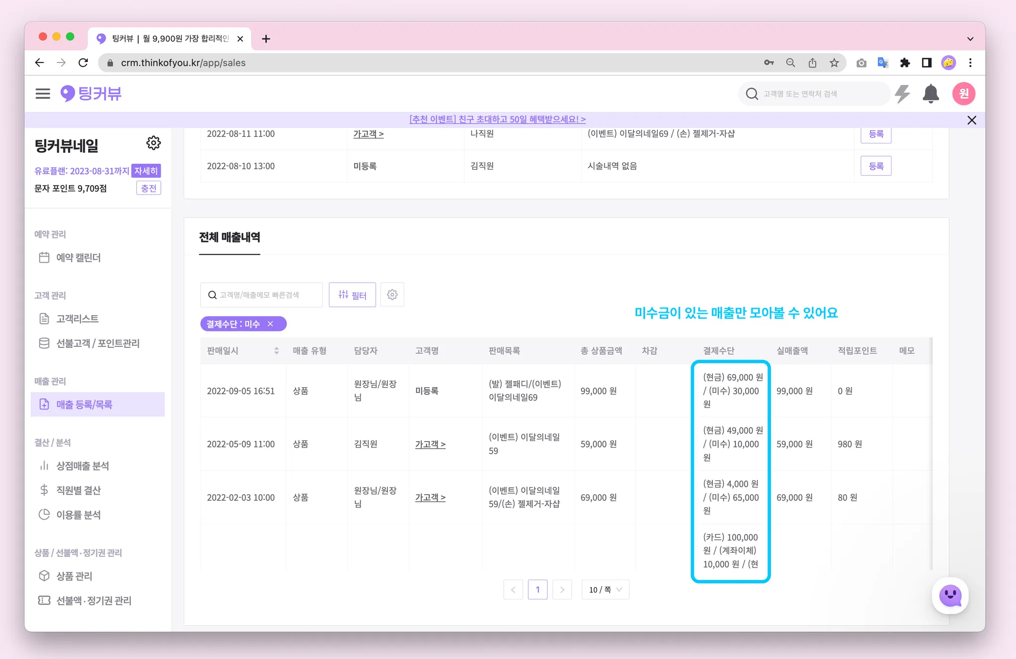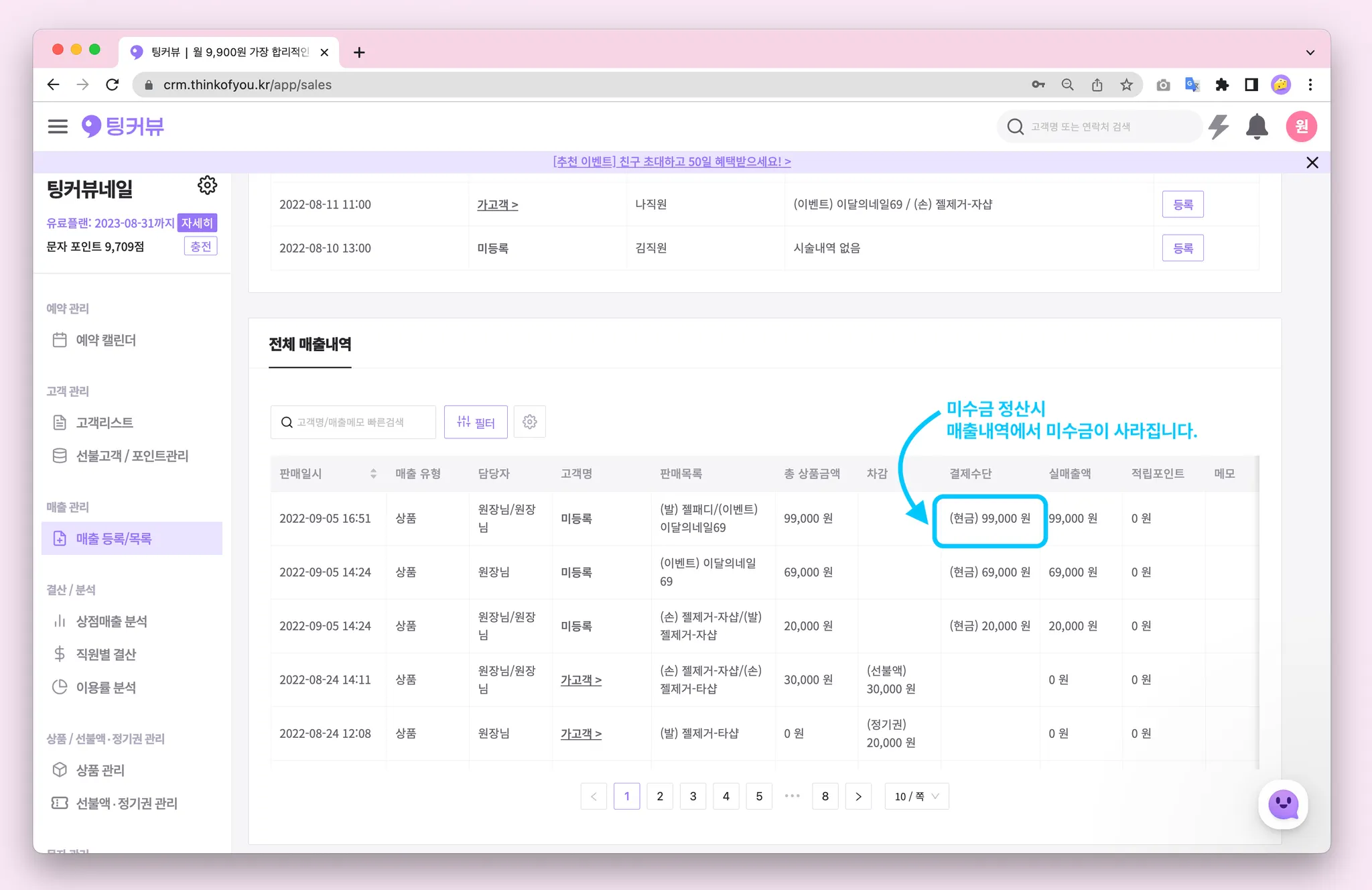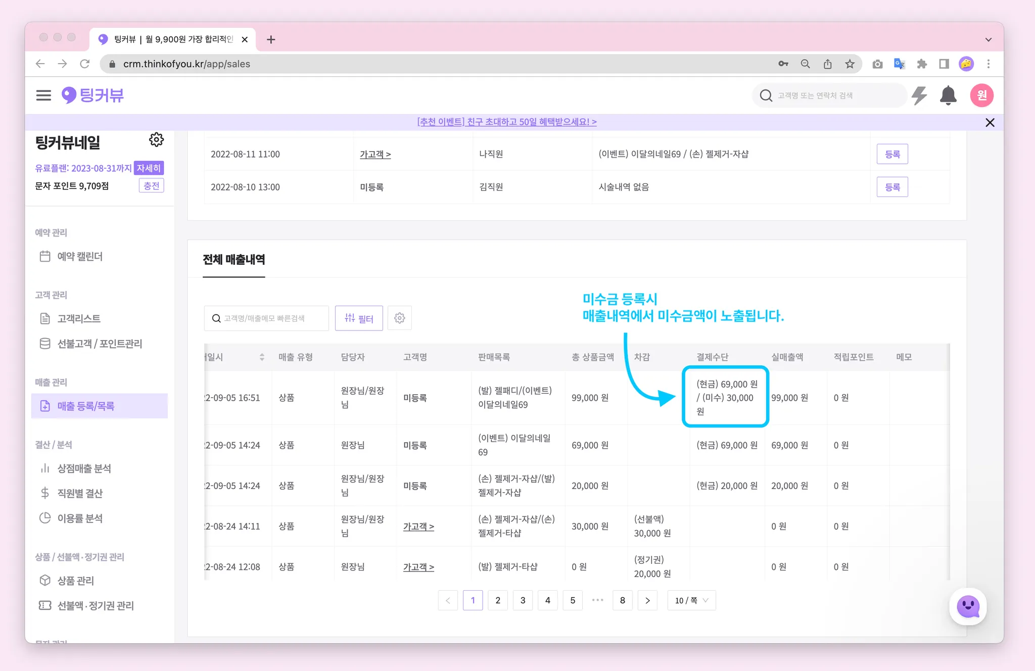 미수금 정산시 매출내역에서 미수금이 사라집니다