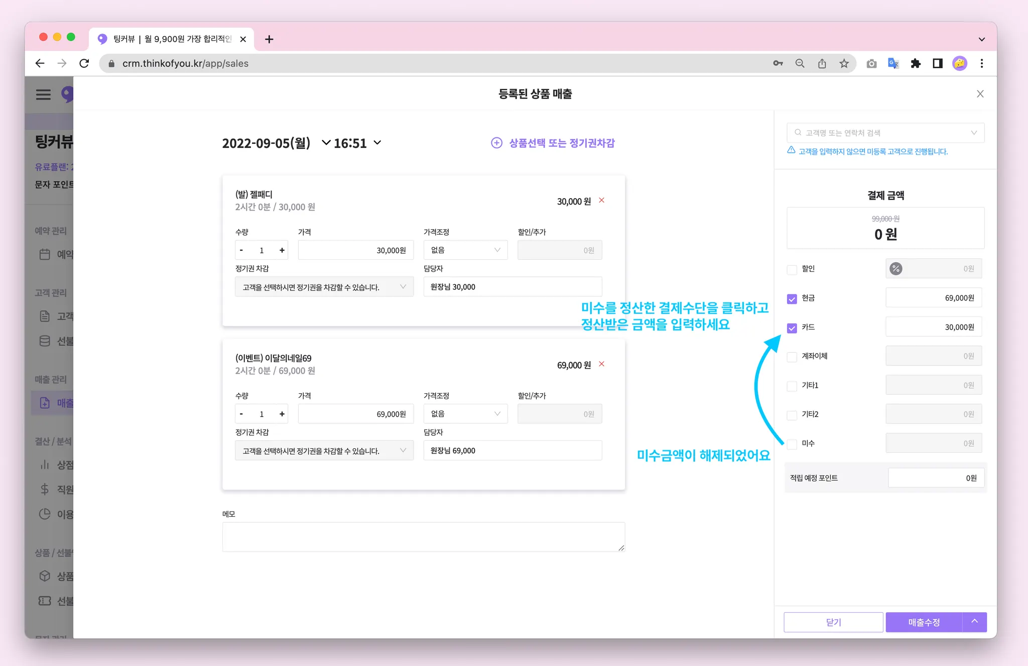 미수를 정산한 결제수단을 클릭하고 정산받은 금액을 입력하세요