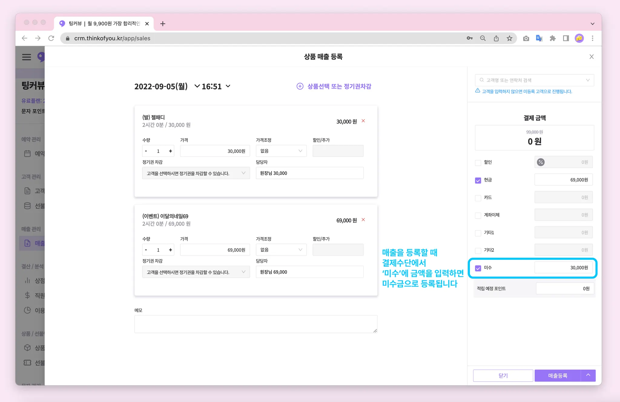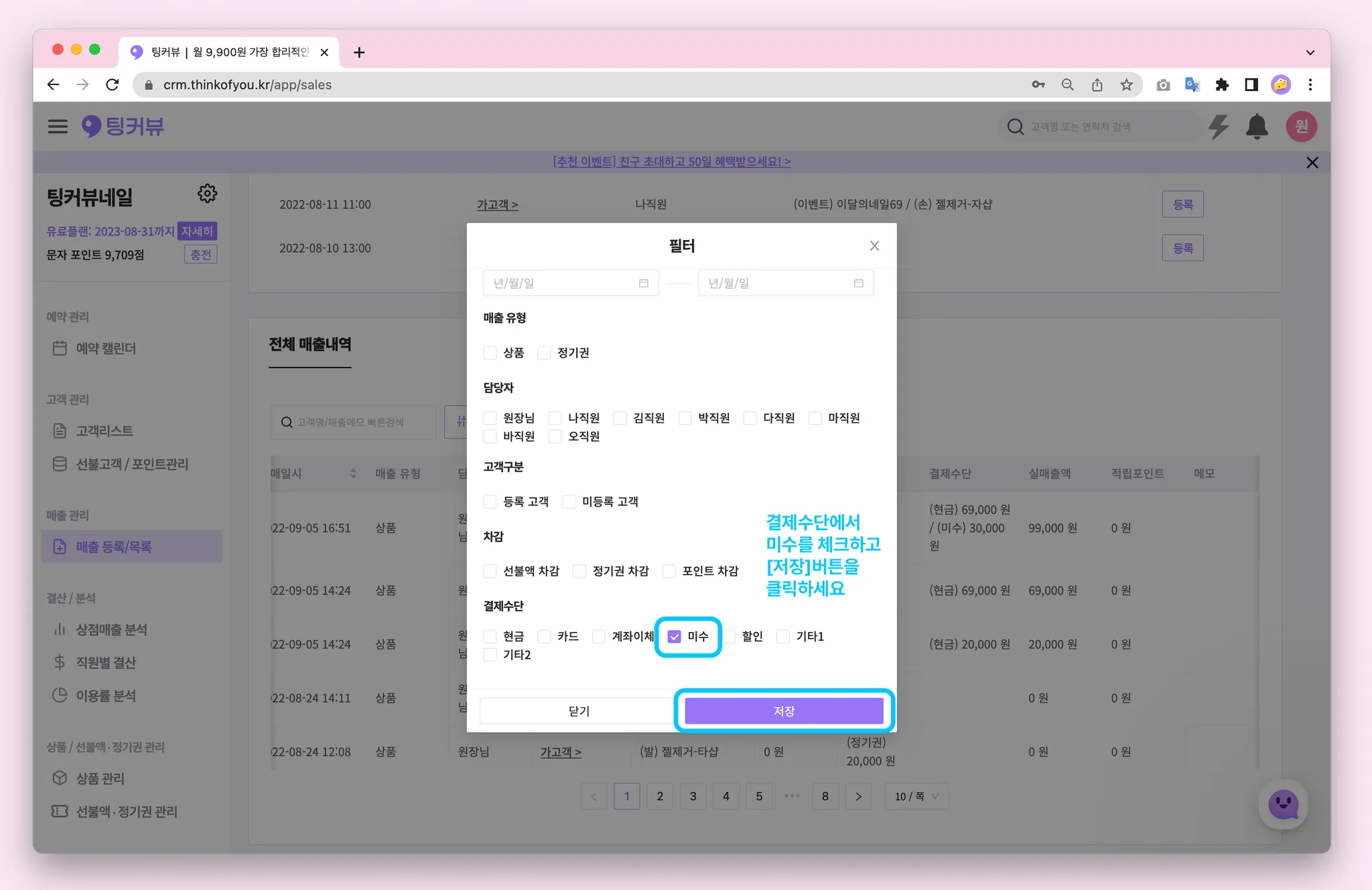 결제수단에 ‘미수'를 체크하고 [저장]버튼을 클릭하세요