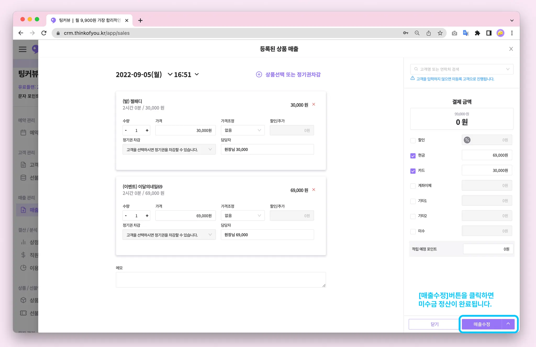 [매출수정]버튼을 클릭하면 미수금 정산이 완료됩니다